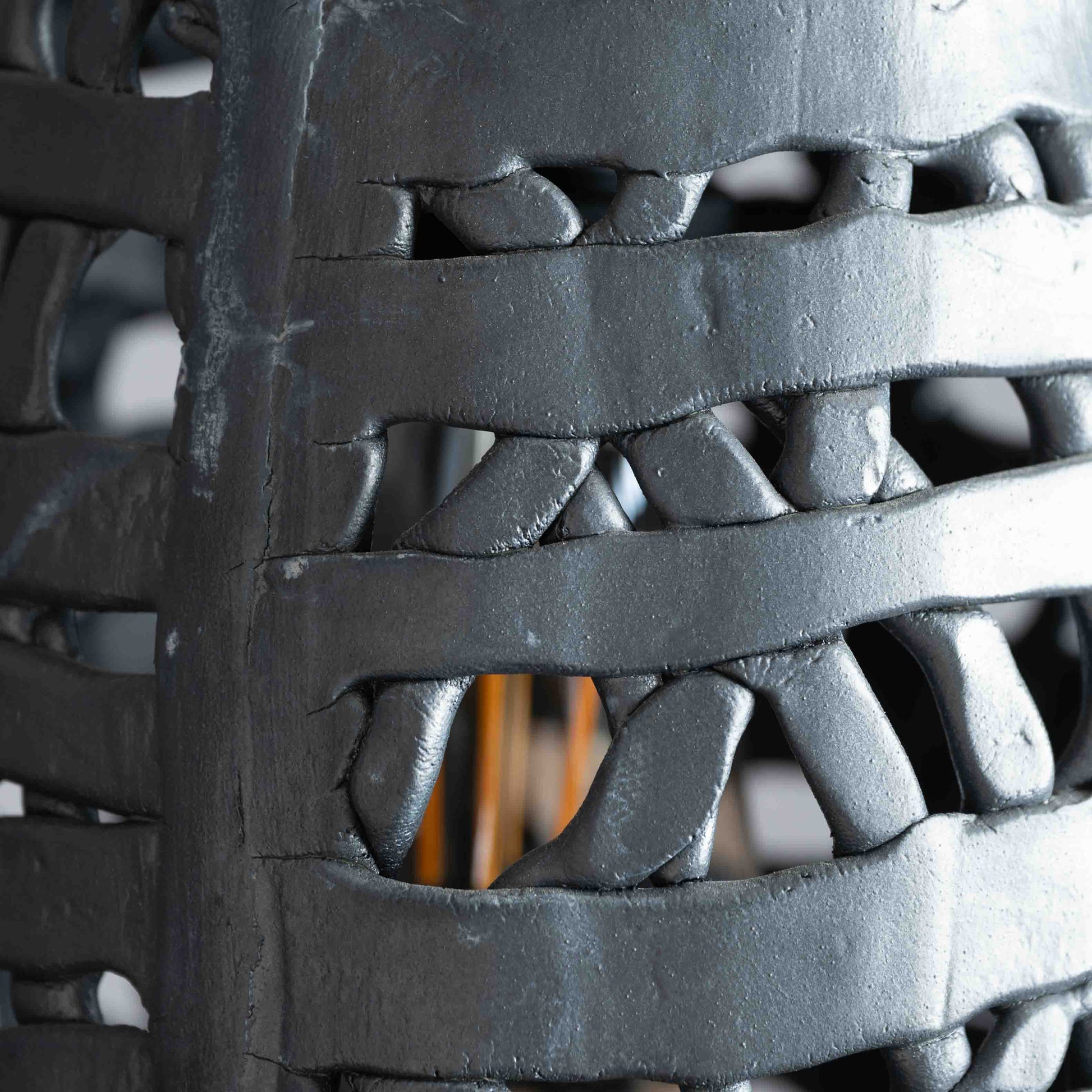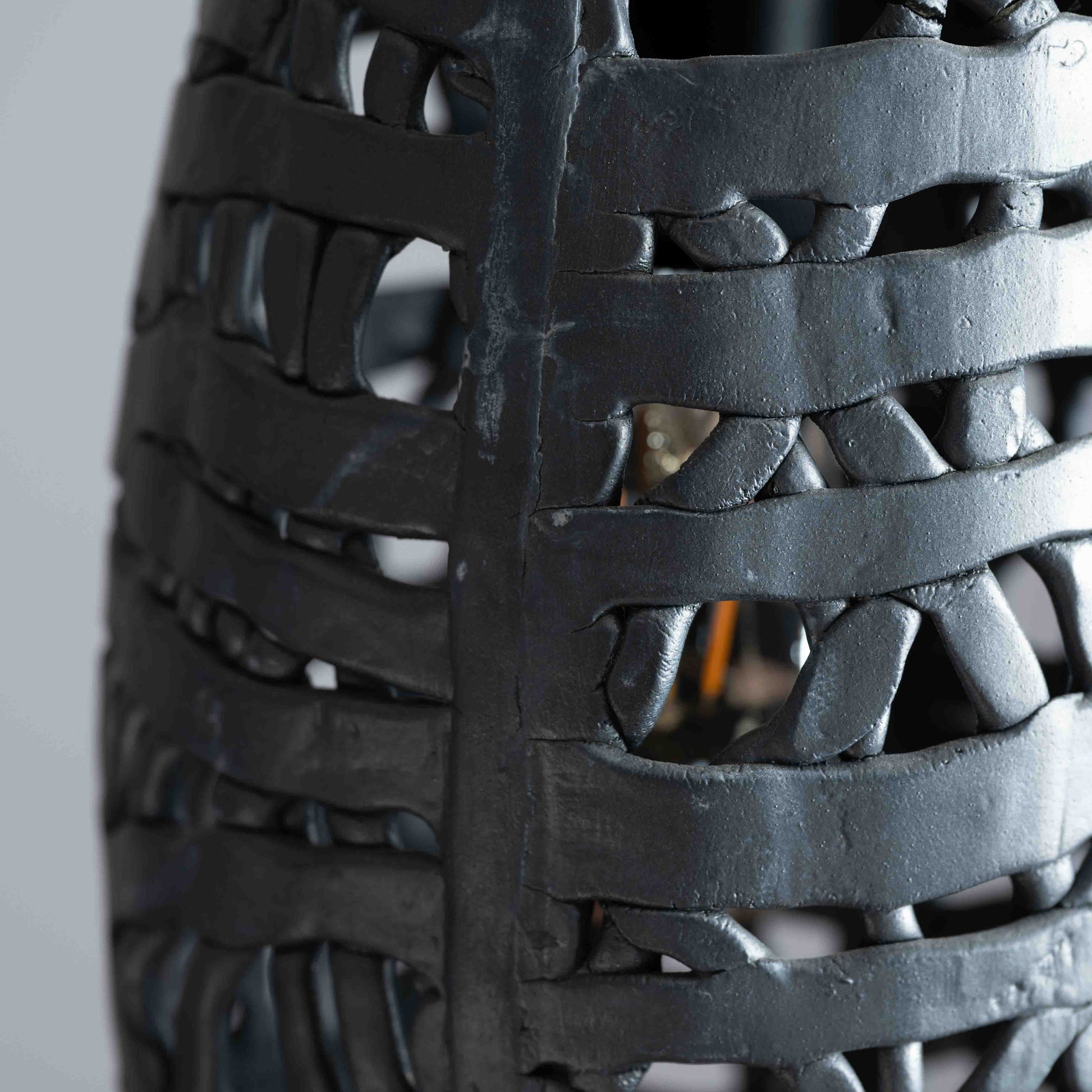 The lamp's distinctive teardrop silhouette mirrors the elegant form of a weaver bird's nest, rendered in hand-crafted black ceramic. The intricate cutout patterns echo the methodical weaving techniques of these master avian architects, creating organic apertures that allow light to filter through like sunshine penetrating a nest's carefully woven chambers.