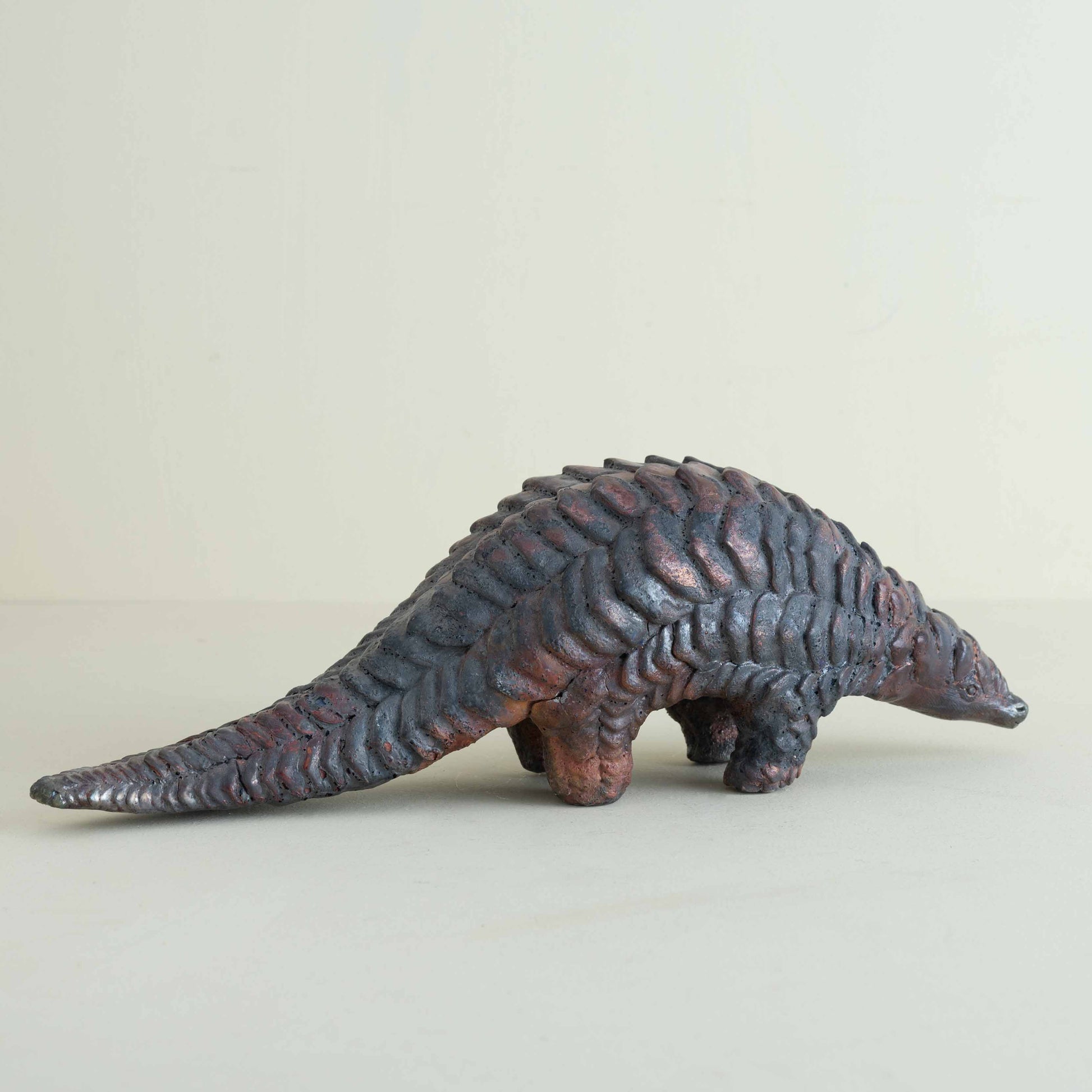This stoneware sculpture is a study in that paradox. The ceramic artist has built the pangolin's body the way the animal builds its own armour: scale by scale, each one individually formed and applied to the clay body before firing, each one slightly different in size and curvature from the one beside it — because no two scales on a living pangolin are identical, and no ceramic approximation of that system should be either. The surface, in dark charcoal-brown with deep iron-oxide undertones that shift toward copper in warm light, has the quality of fired earth returning to stone: dense, ancient, a material that has been transformed by heat into something harder than it was, the way the pangolin's scales harden from soft tissue into the keratinous plates of adulthood.