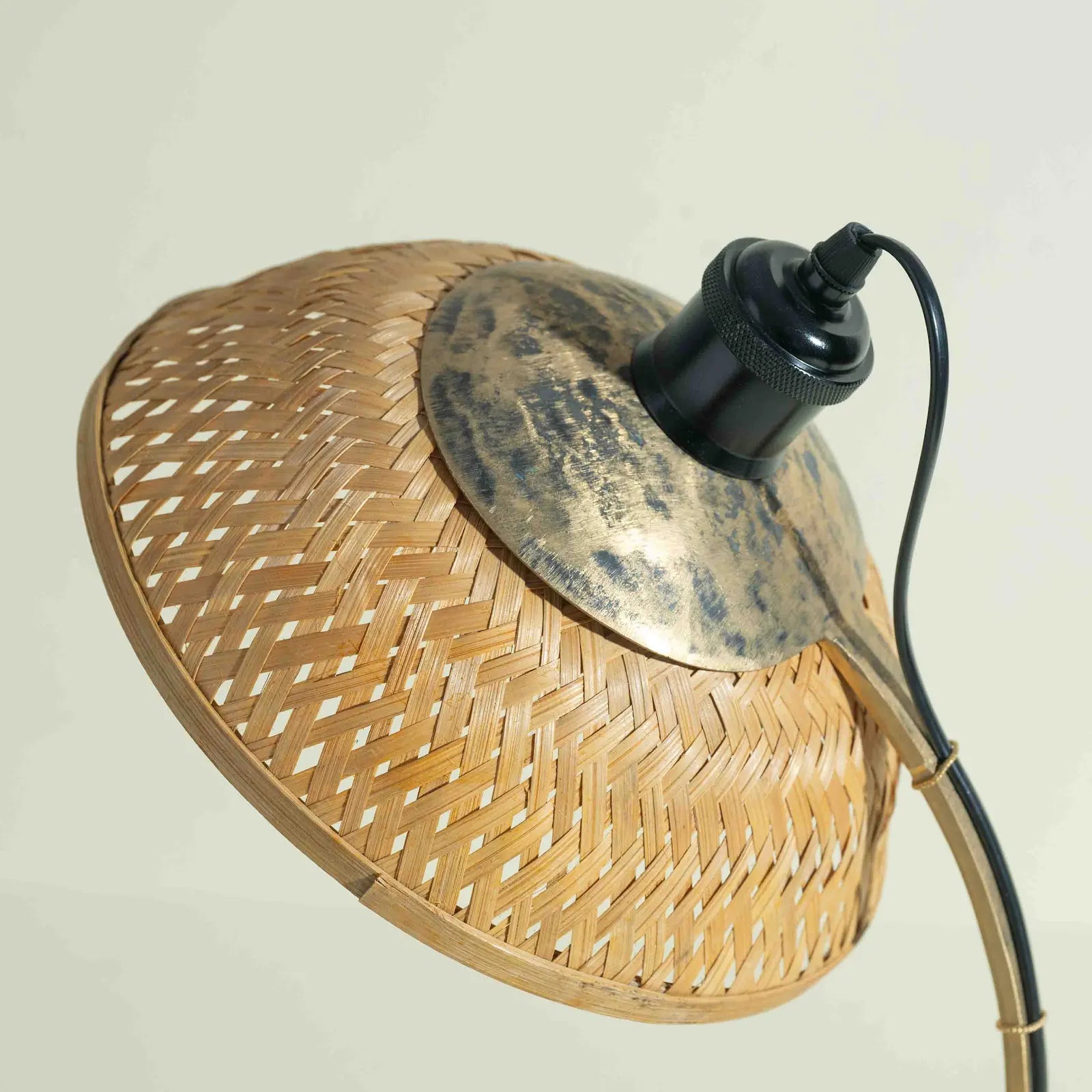 The lamp's bamboo shade showcases the intricate basket-weave technique perfected by master craftsman Ekadasi Barik and his team from Khorda. Each bamboo strip is meticulously interlaced to create a rhythmic pattern that transforms harsh electric light into a warm, honey-toned glow. The natural bamboo allows light to filter through in a mesmerizing play of illumination and shadow, casting gentle patterns on work surfaces and surrounding walls.