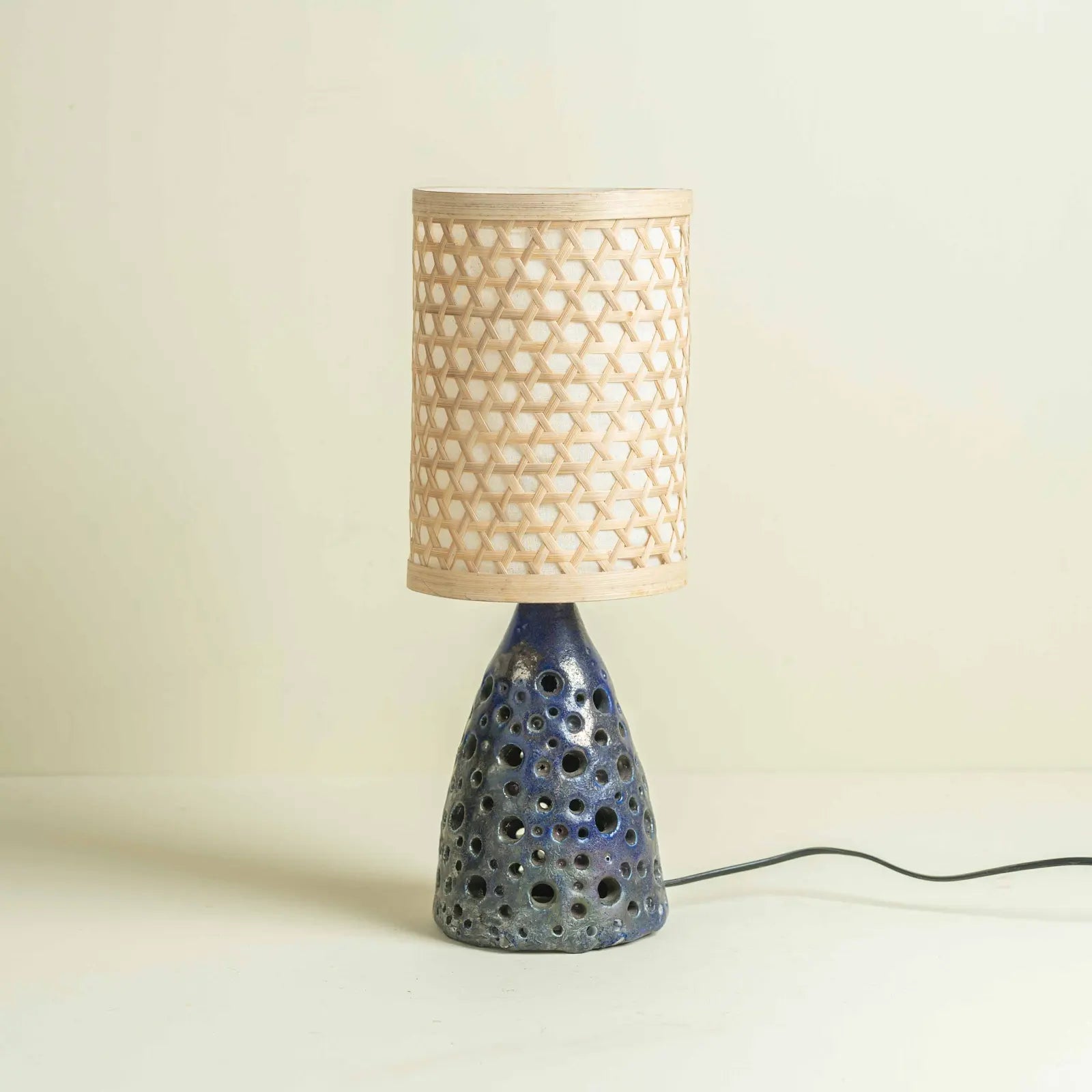 The lamp's sculptural base is a masterwork by ceramist Sarada Rout—a conical stoneware form adorned with an organic pattern of hand-carved perforations in varying sizes. Glazed in a serene blue-teal that evokes ocean depths, the ceramic surface comes alive when illuminated, with warm light spilling through dozens of carefully placed openings. These perforations create a mesmerizing constellation effect on surrounding surfaces, transforming the base into a luminous sculpture that casts dancing patterns of light and shadow.