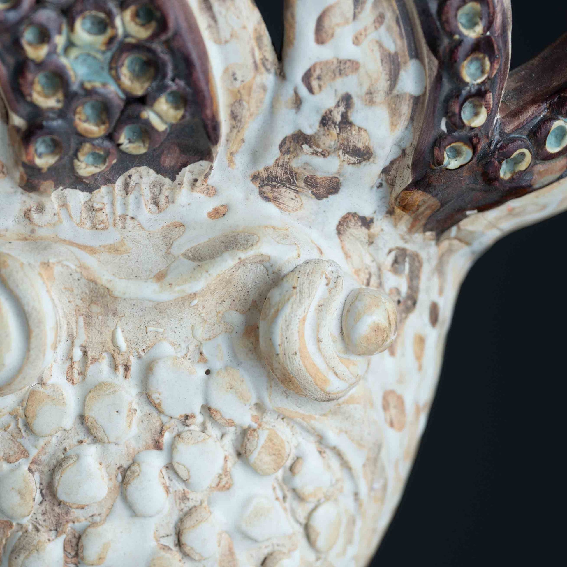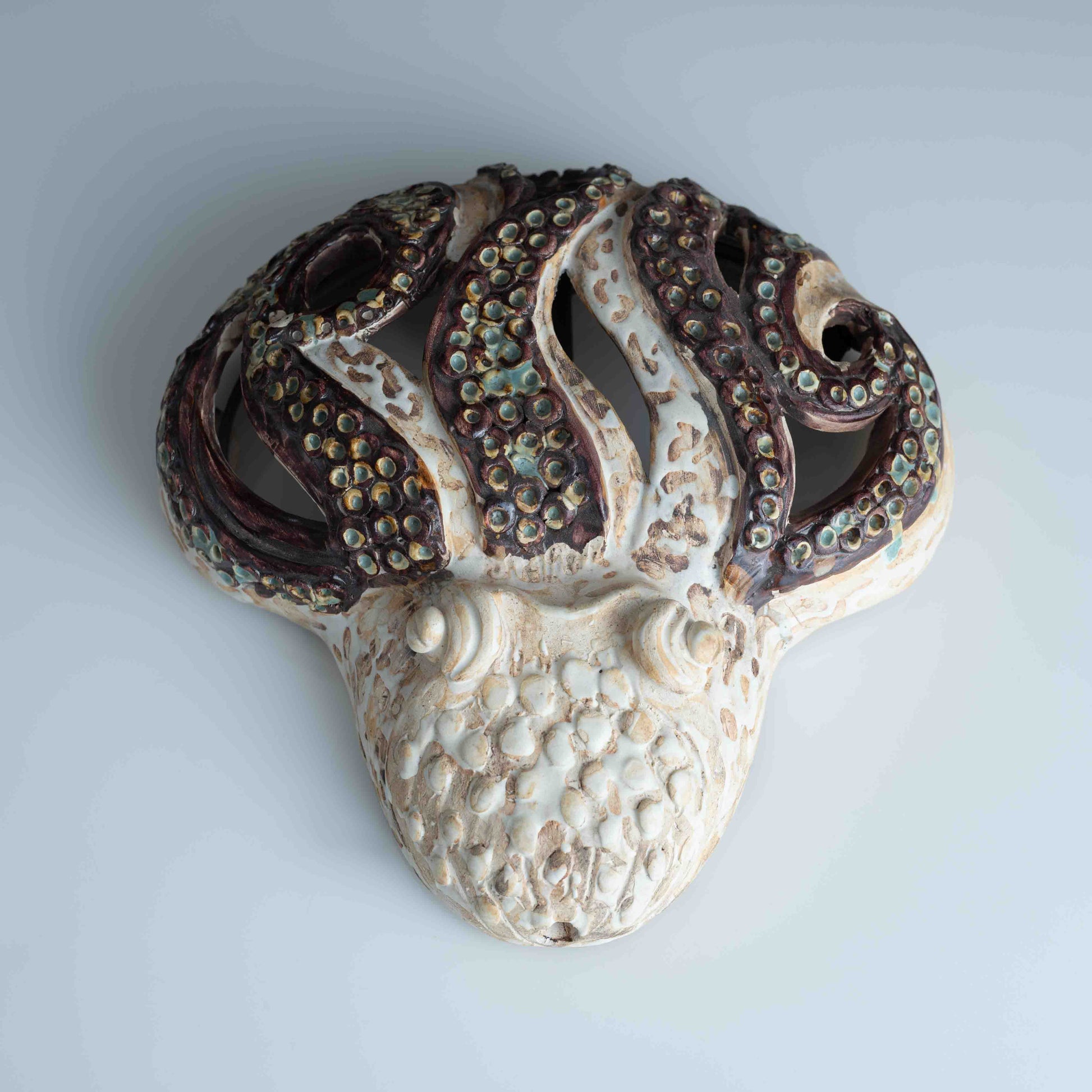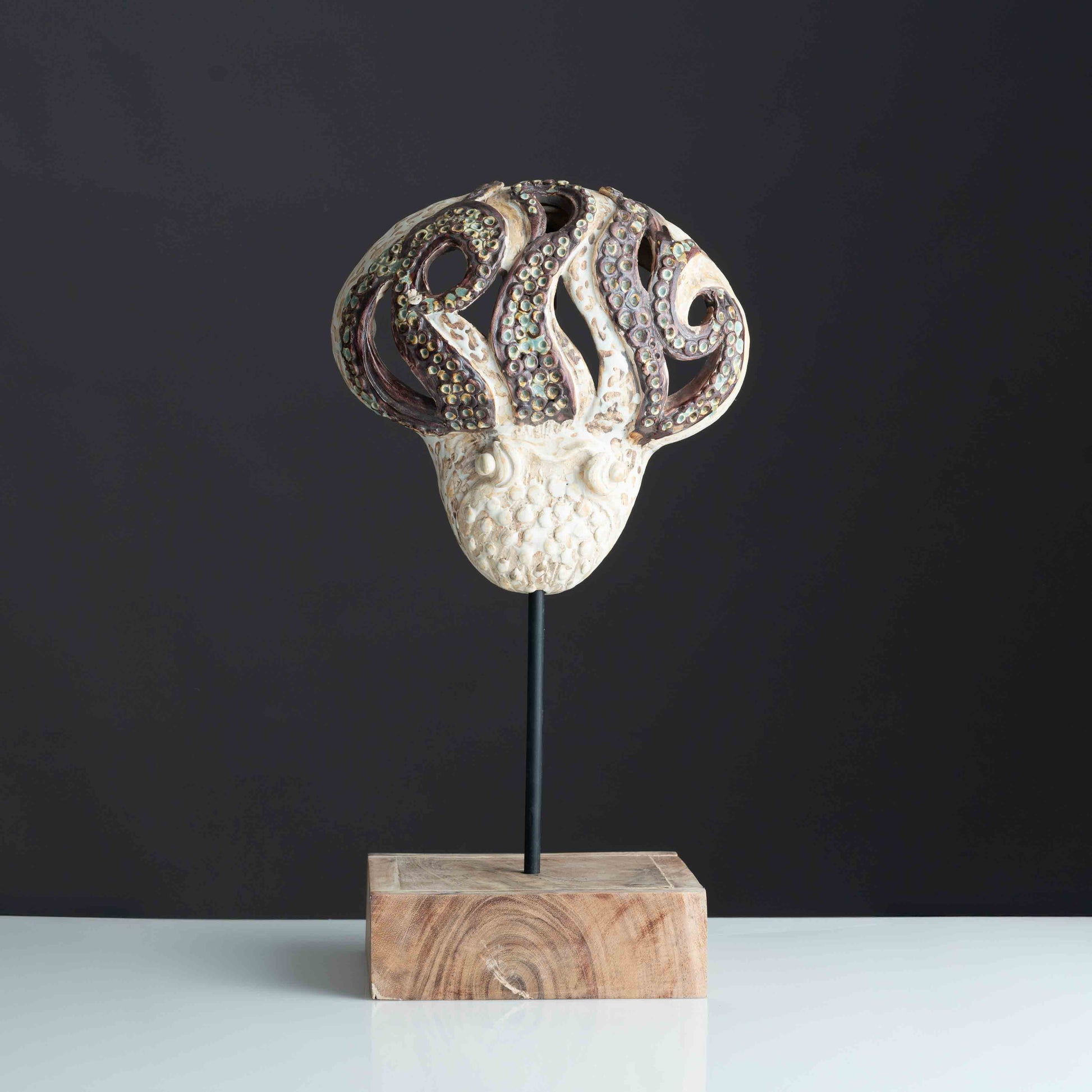 Ashtabhuja is an exquisite sculptural ceramic mask mounted on a natural wooden base that beautifully merges oceanic inspiration with contemporary design. This premium art piece features an intricate dome-like crown of flowing tentacle-like forms adorned with hundreds of meticulous pearl-like beads that catch and reflect light with subtle iridescence.
