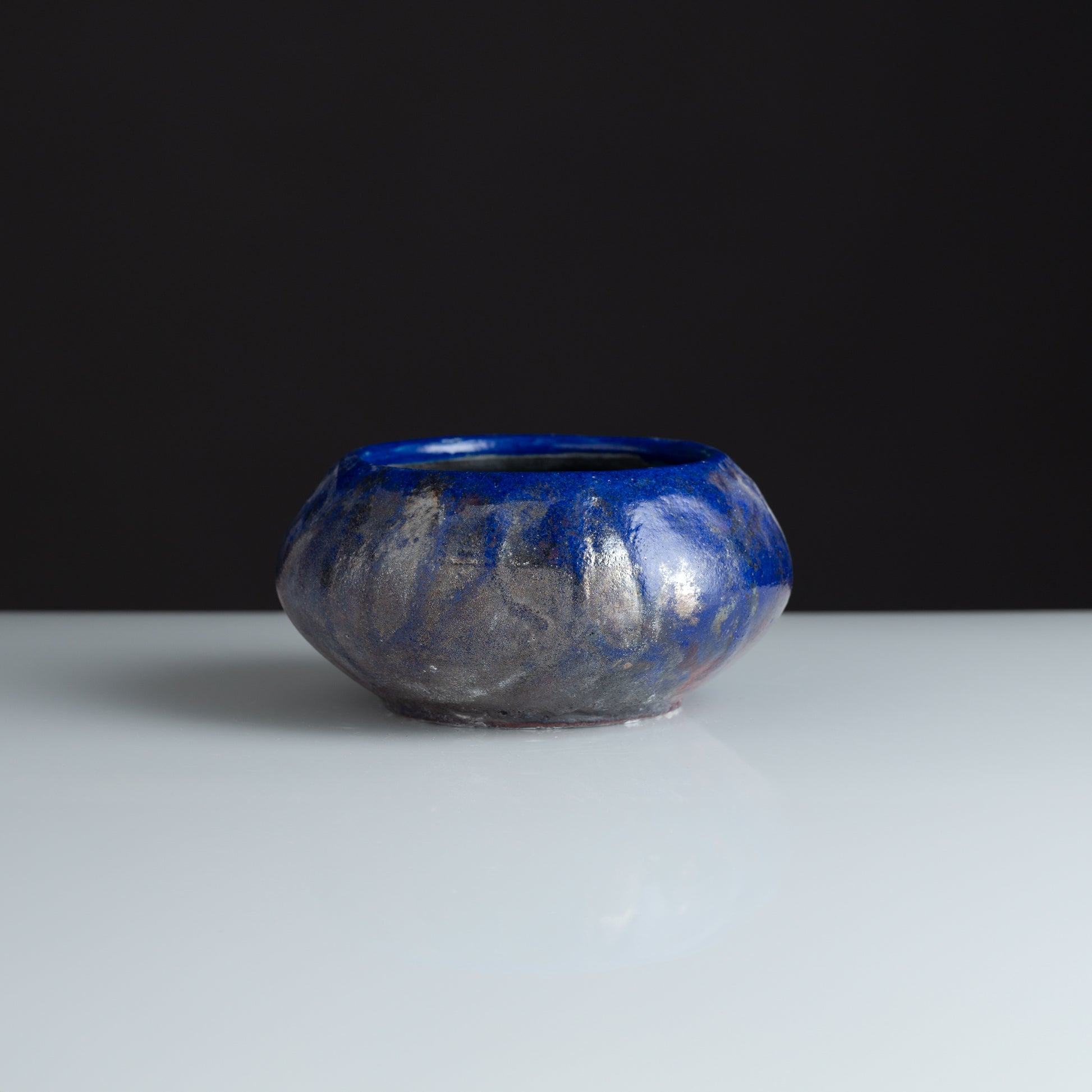 This striking faceted bowl showcases the spectacular beauty of our iridescent blue Raku series. The low, wide form features a vibrant lapis blue interior that transitions to metallic silver and smoky charcoal on the exterior—a distinctive signature of our traditional Raku firing process where each piece undergoes a transformative journey through fire and reduction.