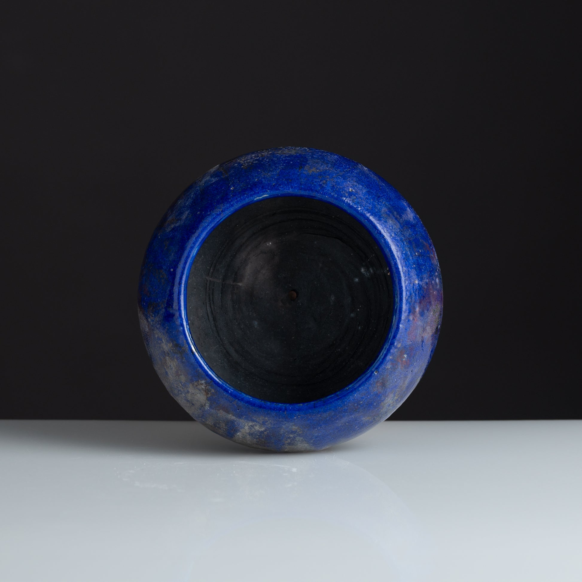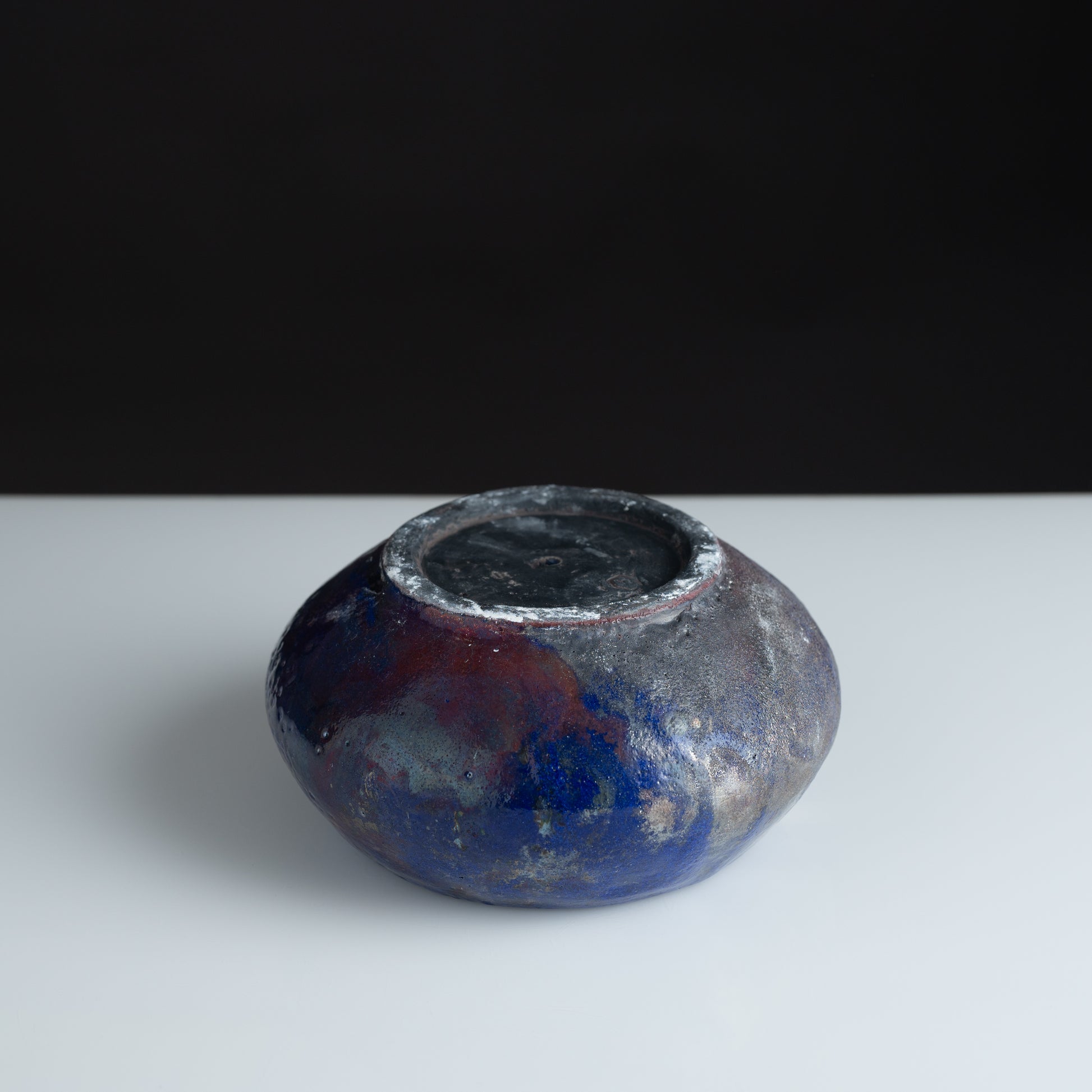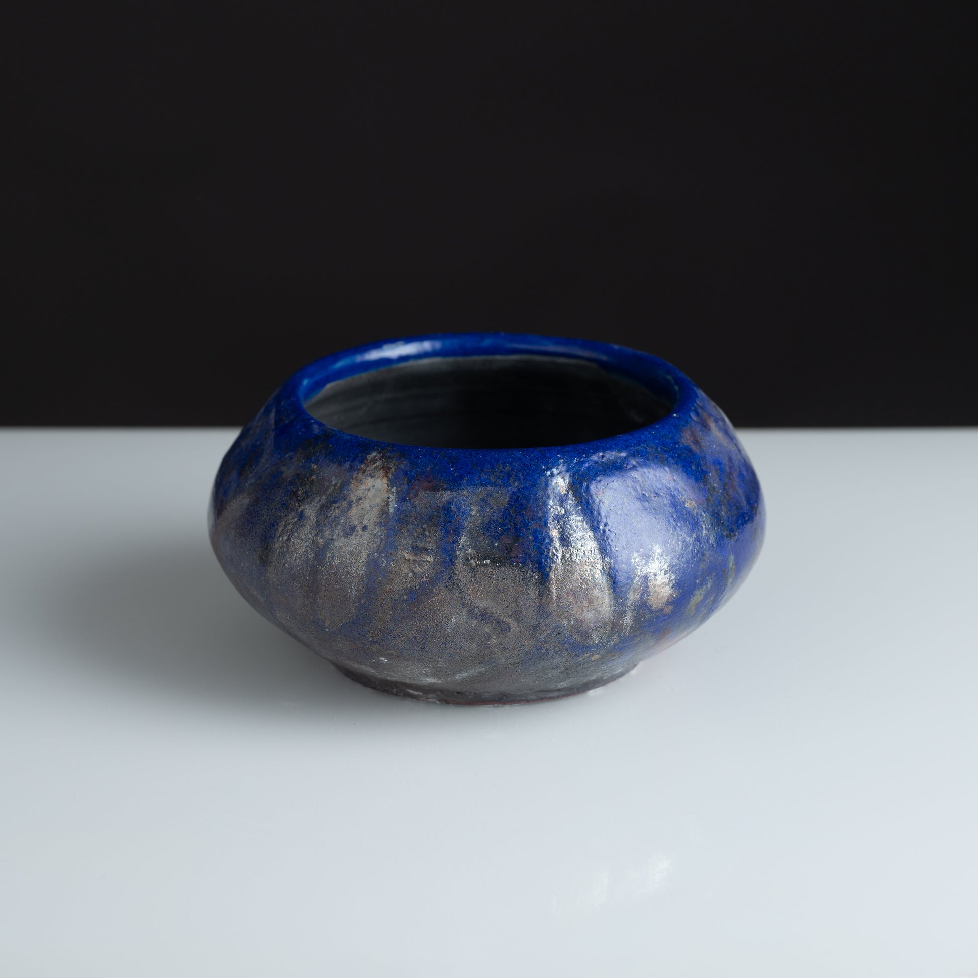 The dramatic contrast between the rich cobalt interior and the silvery exterior creates a compelling visual tension, reminiscent of precious gemstones. Each piece in this iridescent blue series emerges from the firing process with completely unique patterns and metallic highlights, ensuring no two bowls are ever identical.