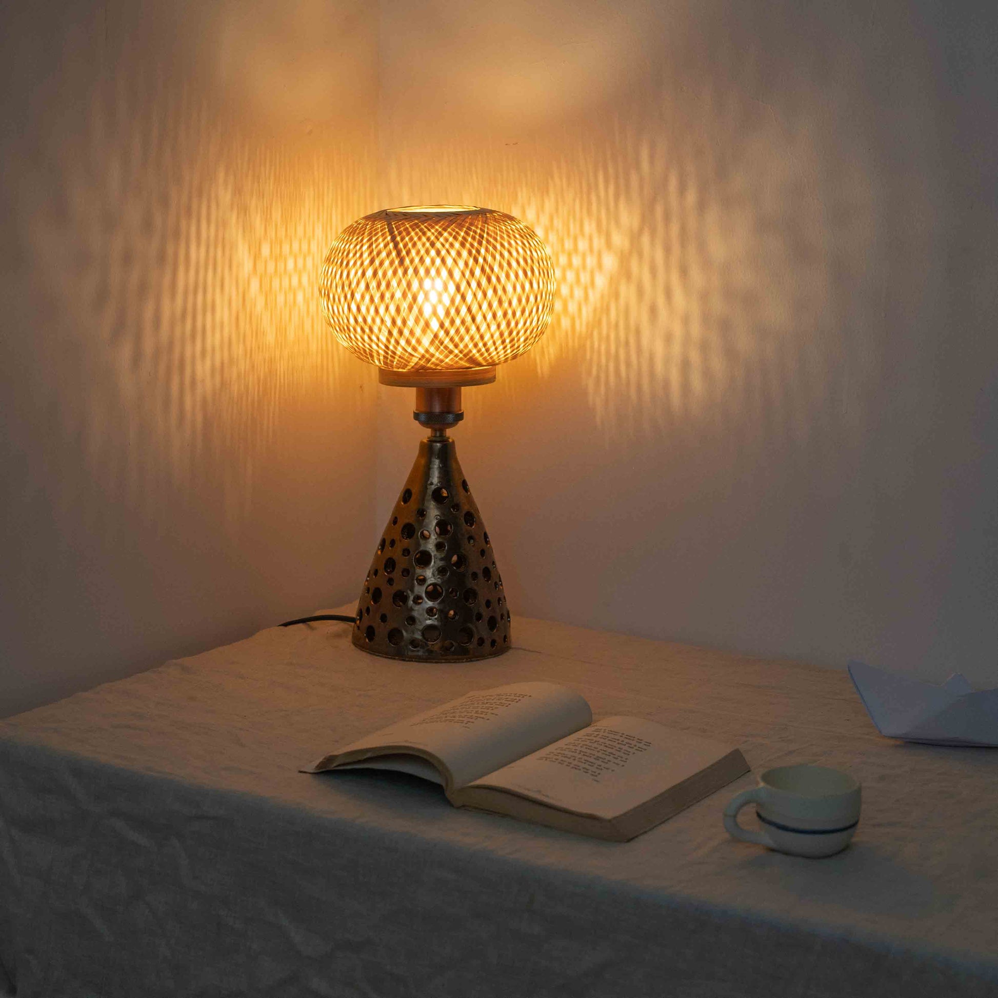 Rising from the perforated base, a cylindrical bamboo shade showcases master weaver Ekadasi Barik's geometric honeycomb pattern—the same intricate interlacing technique perfected through generations of Khorda artisans. The muslin interior liner diffuses the upper light softly while the bamboo weave creates its own delicate shadow play, complementing the base's stellar patterns.