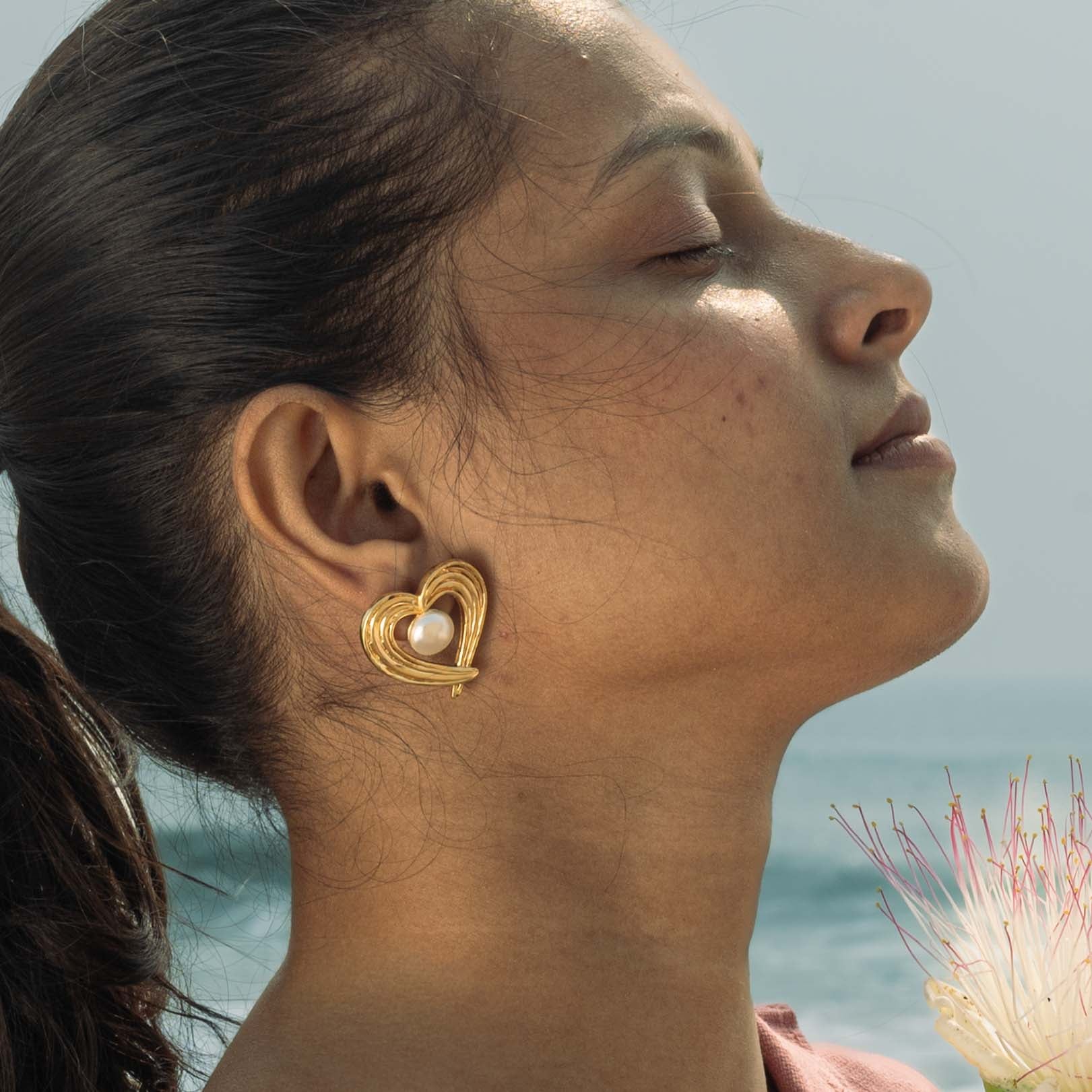 Large enough to make a statement, the Hridaya Earrings are studs by nature — they do not swing, they do not move. They rest. They anchor. They hold. Released for February, they carry the feeling of love and connection through the rest of the year without sentiment, because the heart that knows rivers understands that love is not seasonal