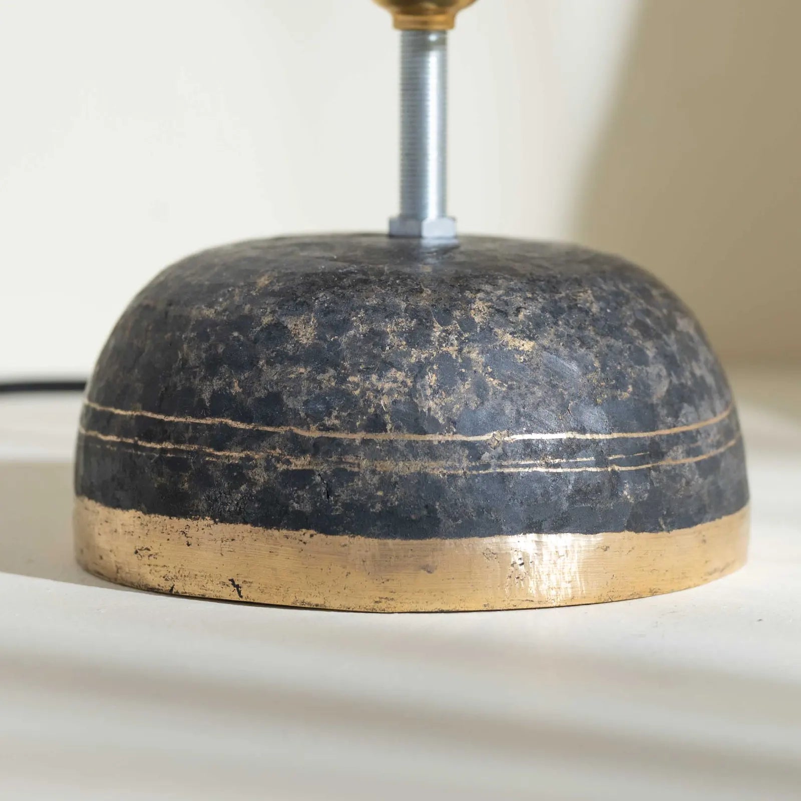 The base showcases exquisite Raku ceramic work with organic speckled glazing that celebrates the unpredictable beauty of fire and earth. The contrast between the geometric precision of the metal shade and the organic, tactile warmth of the ceramic base creates visual poetry that speaks to both the mind and soul.