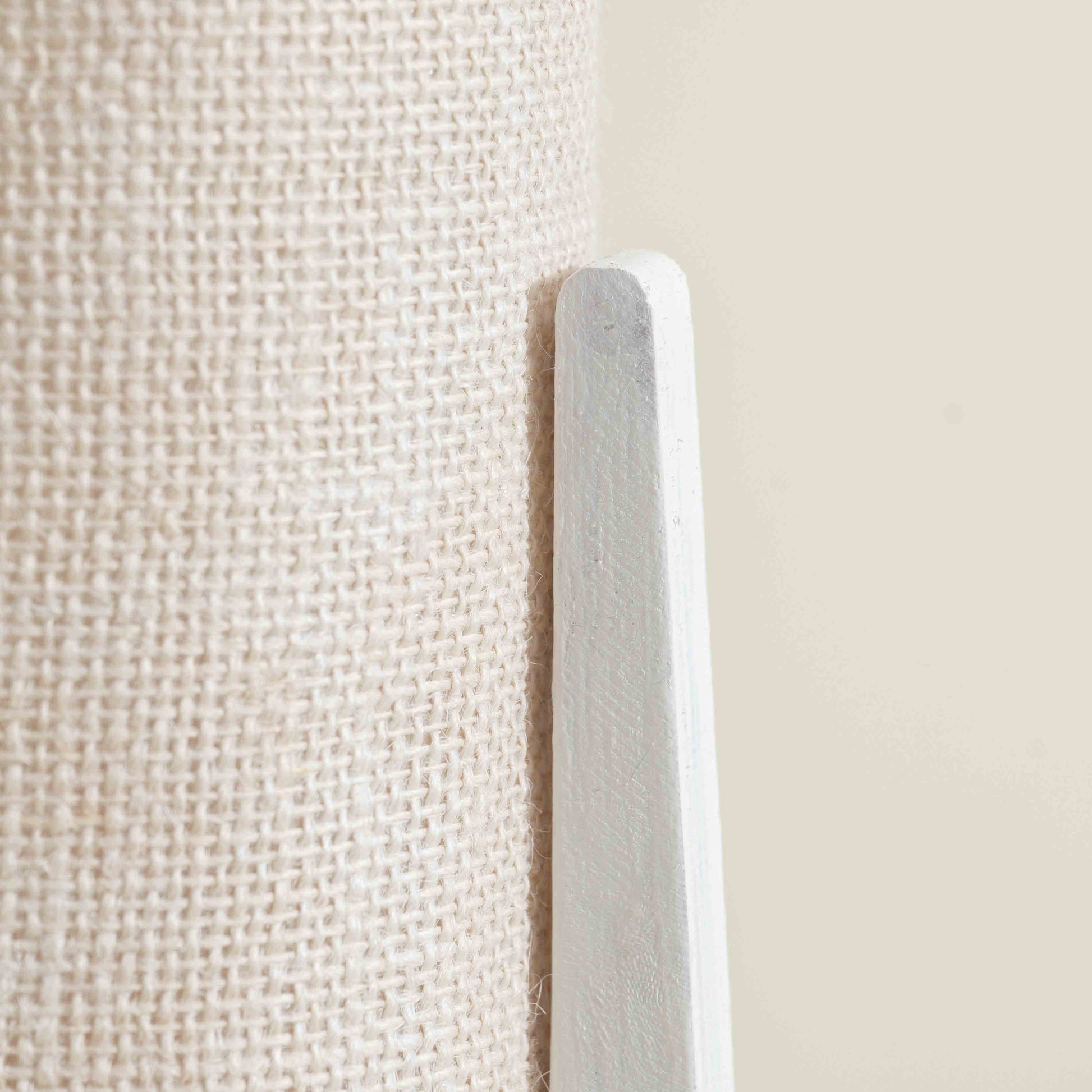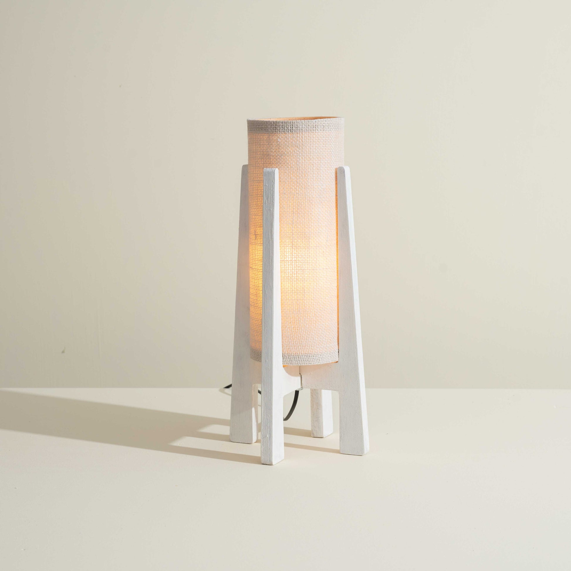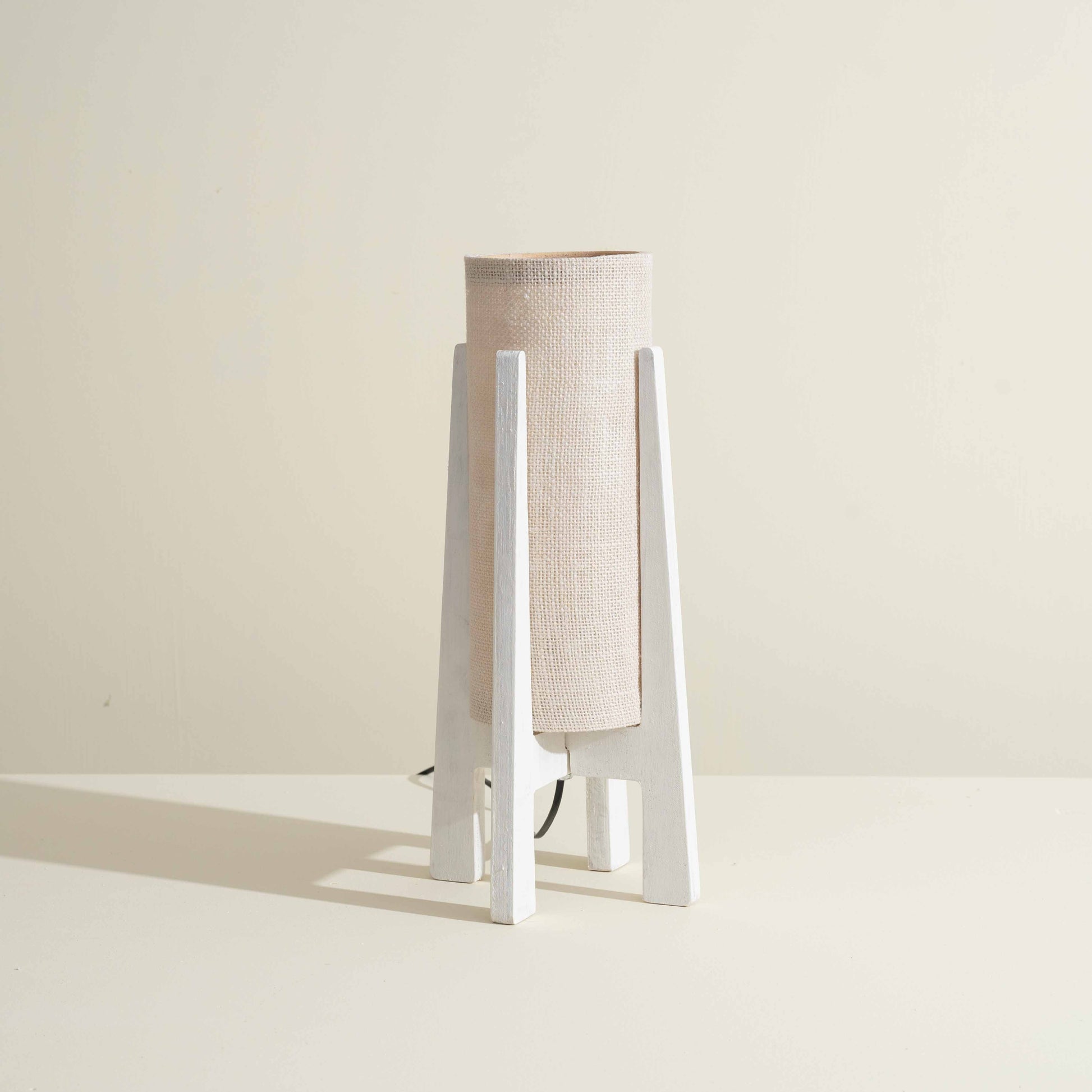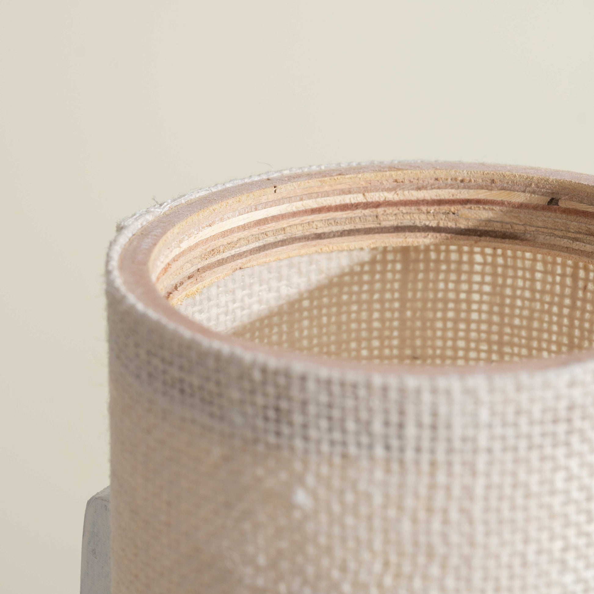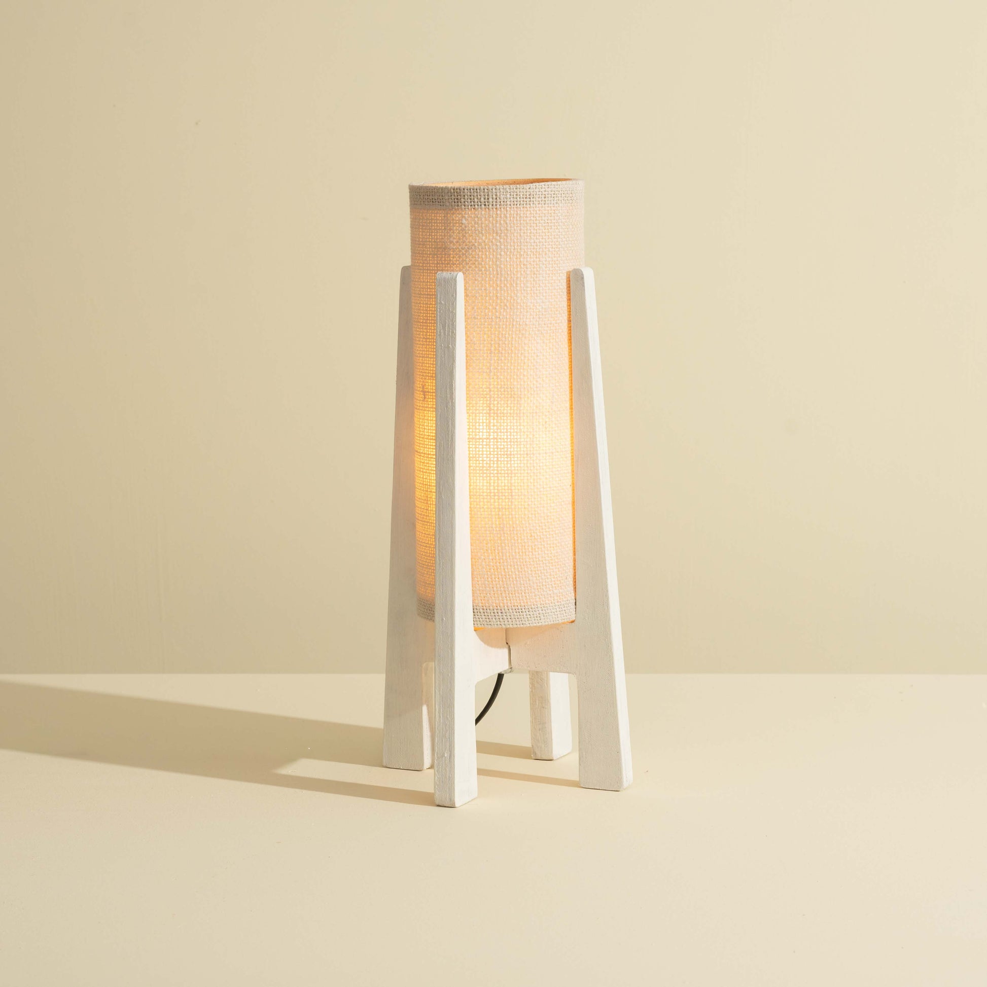 The cylindrical jute shade showcases the natural texture and warm golden tones of handwoven fabric, creating a soft, flowing luminescence that transforms any space. The precision-cut plywood tripod base provides elegant stability while maintaining the lamp's commitment to eco-conscious materials.