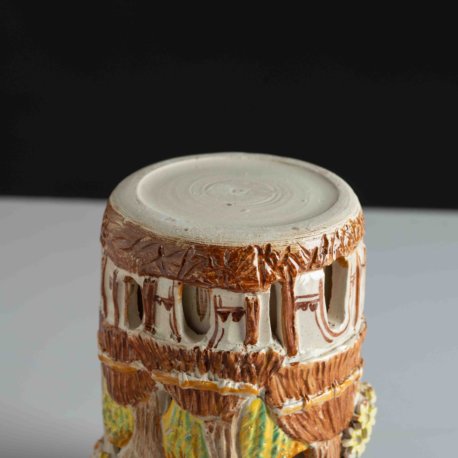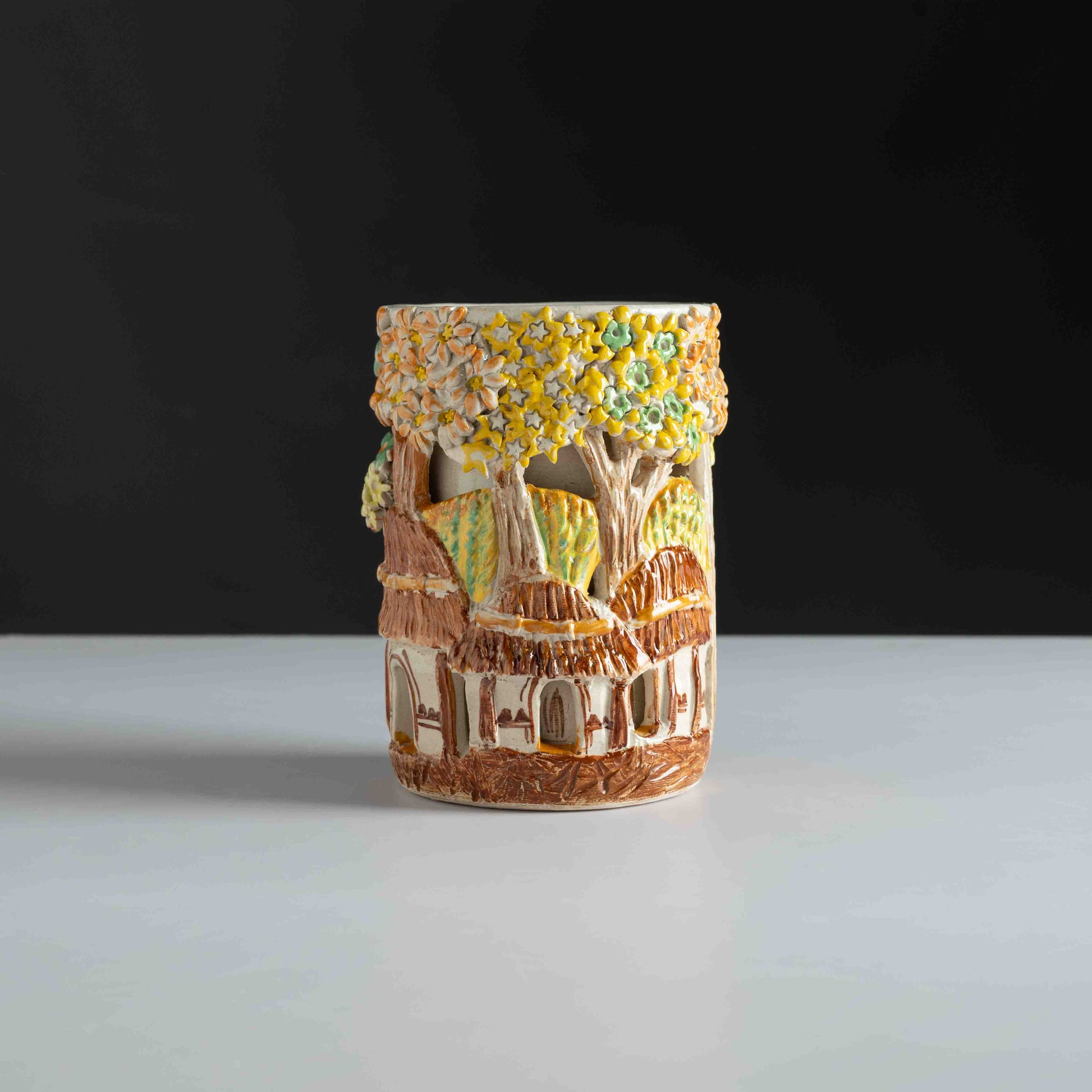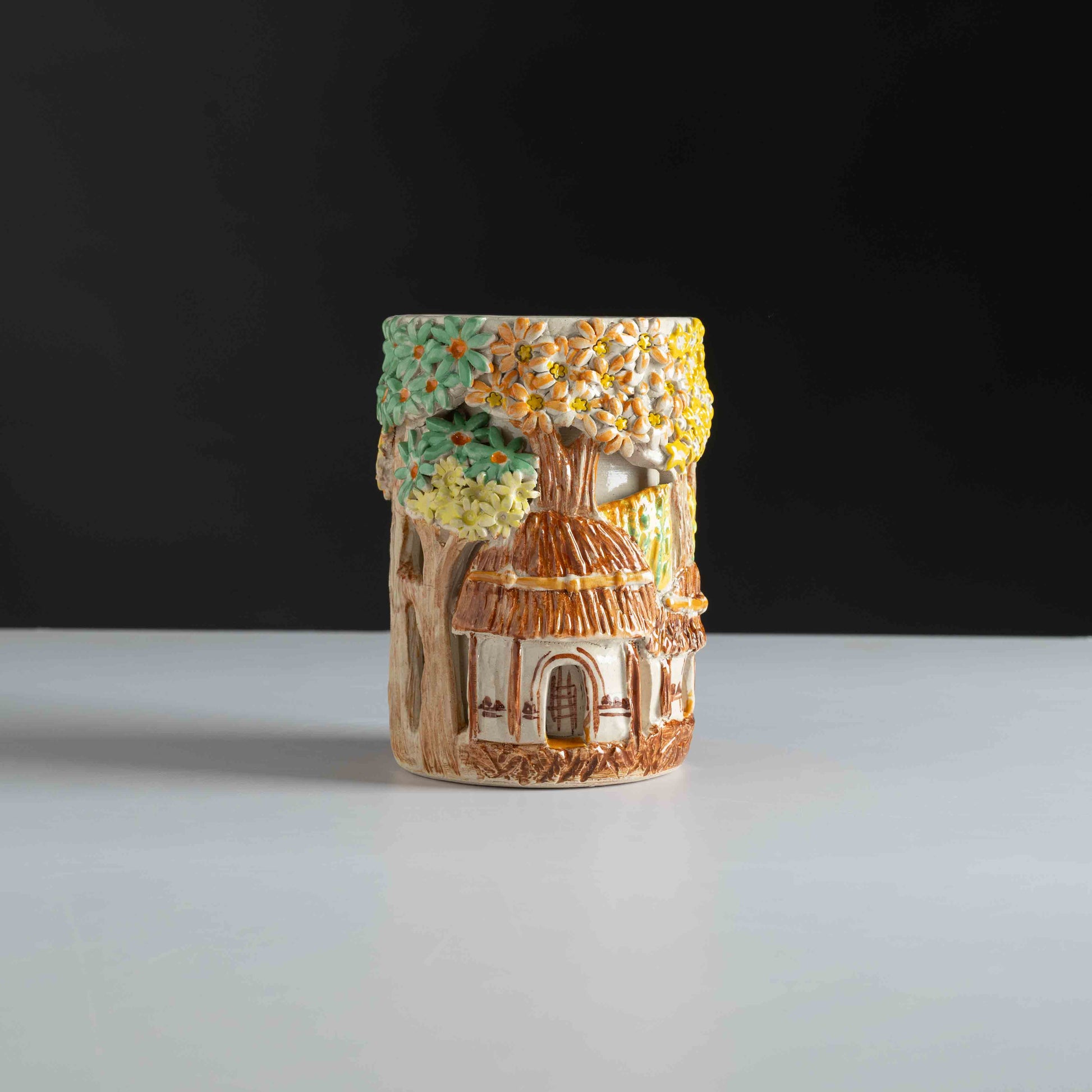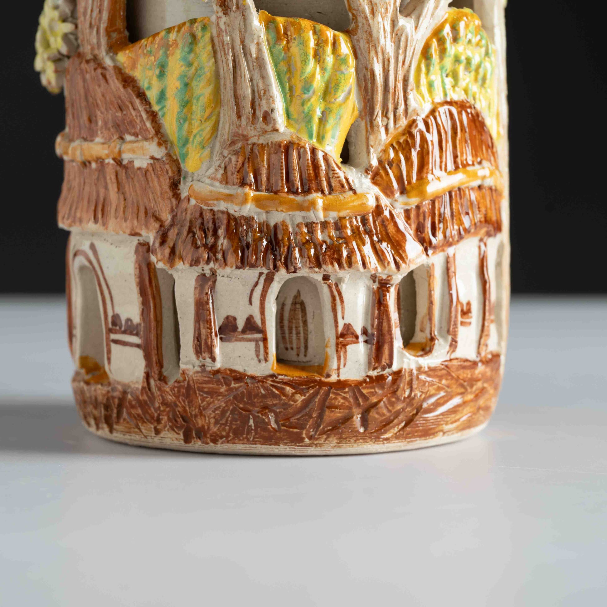 Each vase is meticulously constructed with two distinct ceramic layers: an inner vessel for functionality and an outer sculptural shell that serves as a canvas for intricate village scenes. The lower section depicts detailed village architecture with traditional houses, delicate windows, doorways, and architectural elements that speak to generations of rural craftsmanship. Every structural detail—from the textured walls to the miniature balconies—is individually hand-carved and painted with remarkable precision.
