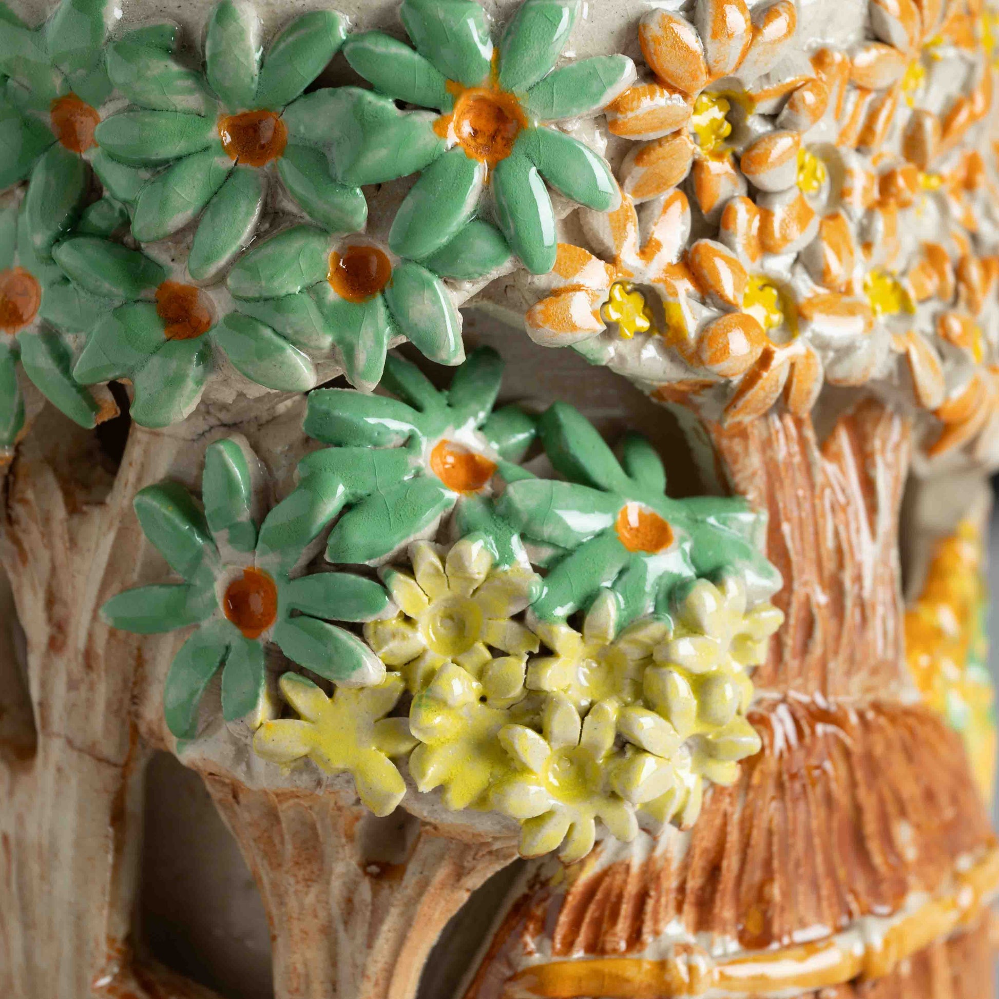 The upper section bursts into a magnificent floral canopy, where hundreds of individually crafted ceramic flowers in vibrant oranges, teals, and whites create a three-dimensional garden that seems to float above the village scene. This dual-layer construction creates both visual depth and symbolic meaning, representing the harmony between human habitation and natural abundance.