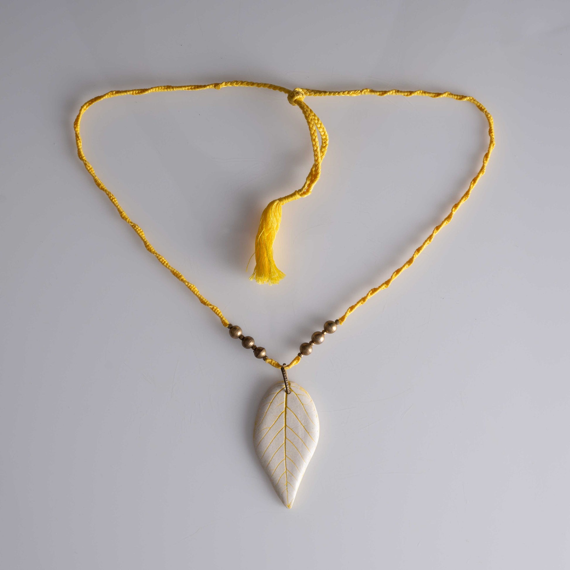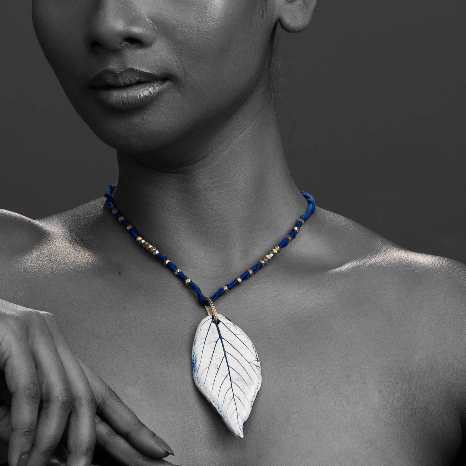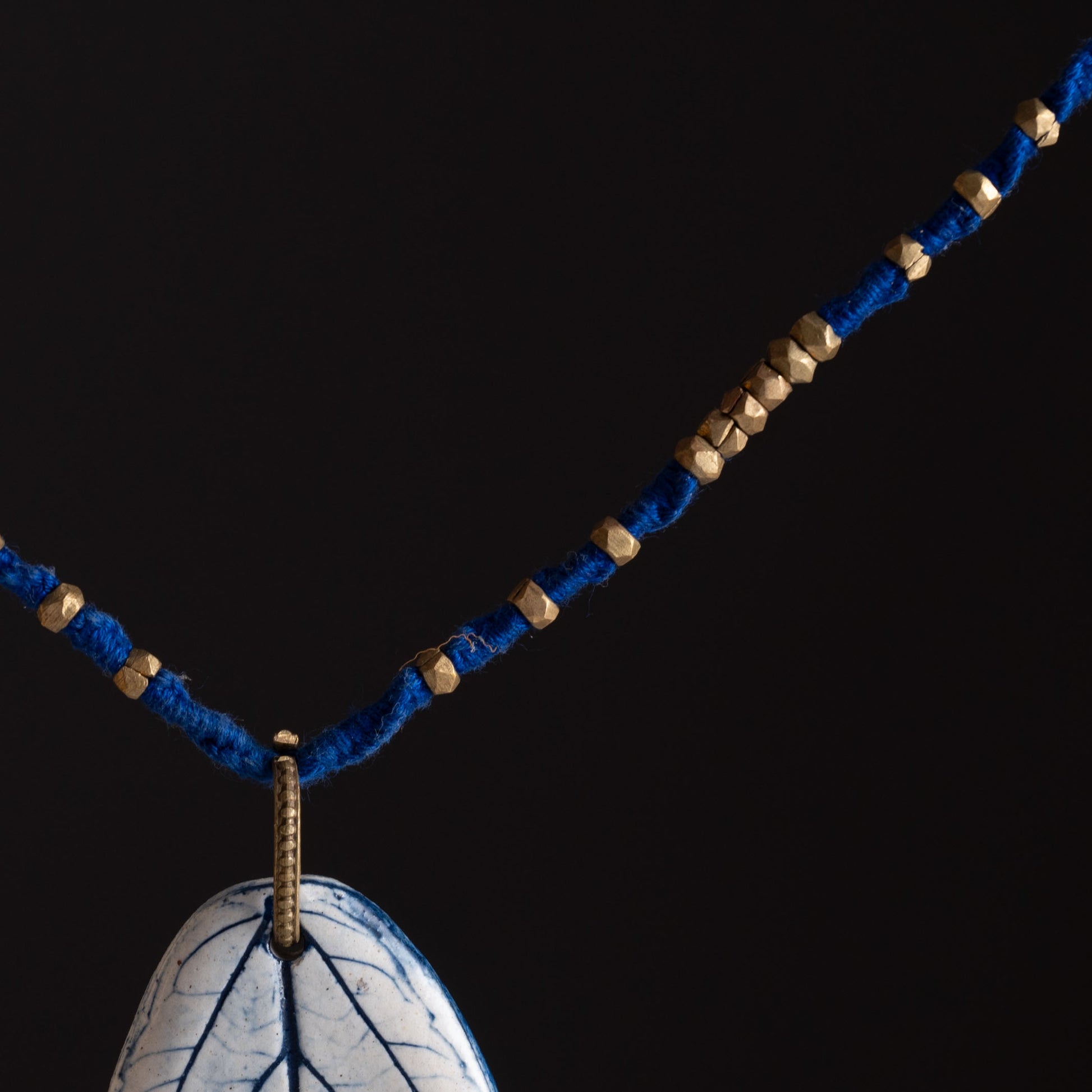 The Sida Acuta Burm, Sunakhodiya in Odia, is a hardy plant with small yellow flowers and a long history of use in traditional medicine. Revered for its healing properties, Sunakhodiya is often used in folk remedies to treat wounds, fever, and various ailments. The plant symbolizes resilience and the deep connection between nature and health, reflecting the wisdom of Odisha's herbal traditions. Our depiction of the Sunakhodiya leaves, with their intricate veins captured in ceramic stoneware, is complete with a chain made of natural fibres and adorned with dhokra beads. Packaged in a hand-carved wooden box, this pendant serves as a reminder to wear our living heritage with a smile.