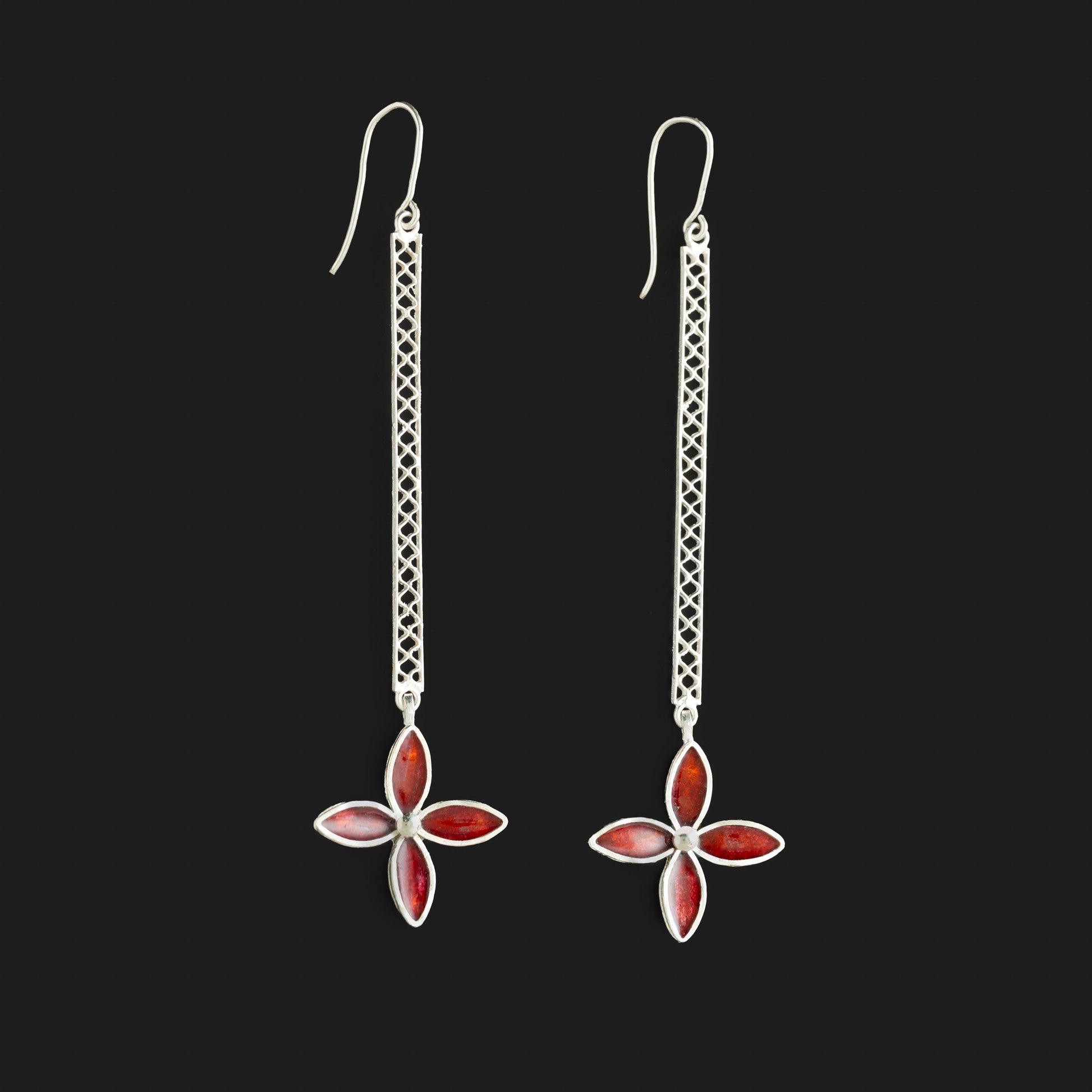 The dramatic vertical lines culminate in the signature four-petal Ashoka blossom, rendered entirely in rich crimson enamel that captures the flower's vibrant essence. The substantial length and weight of these earrings create beautiful movement, while the geometric precision of the filigree work provides a contemporary edge to this deeply traditional craft technique.