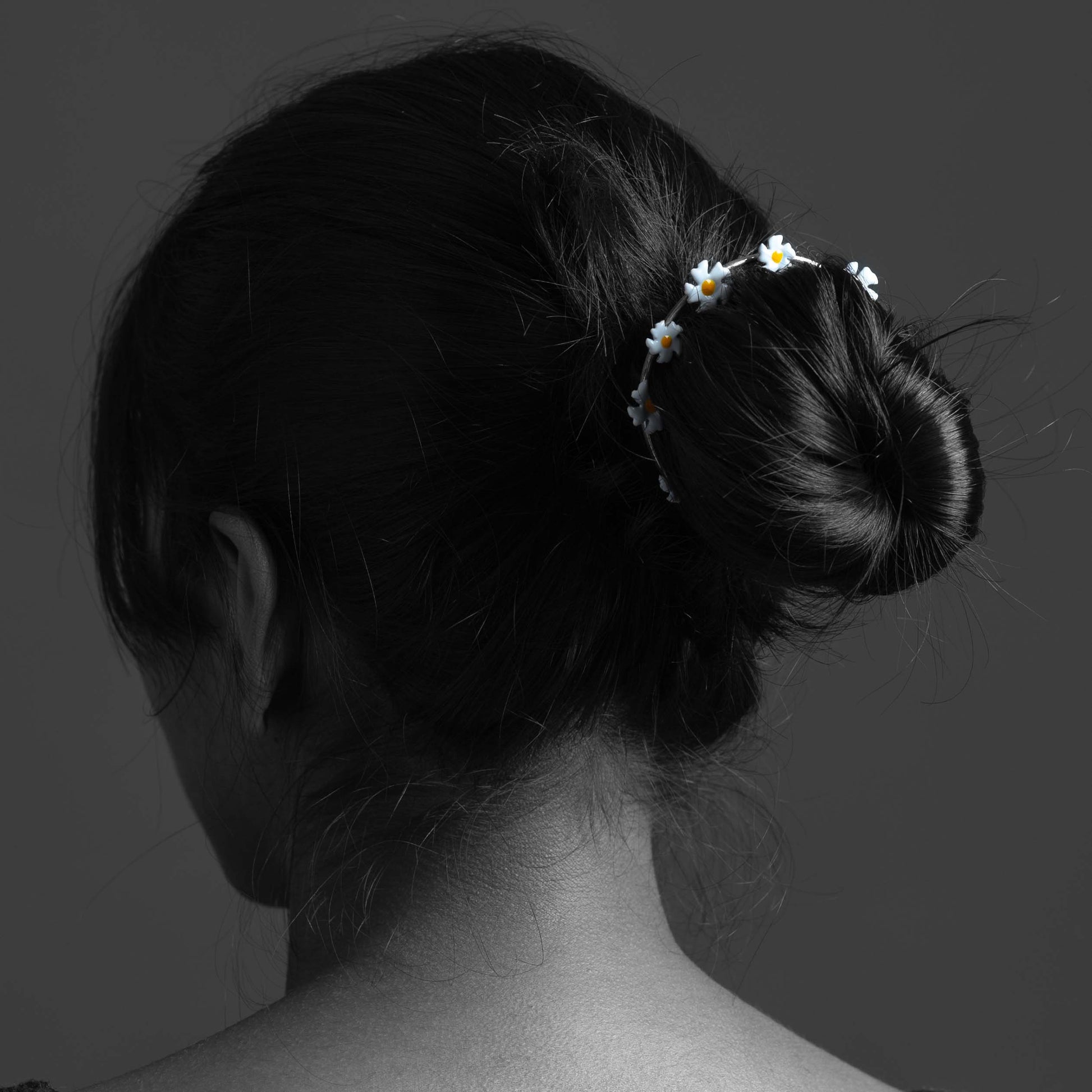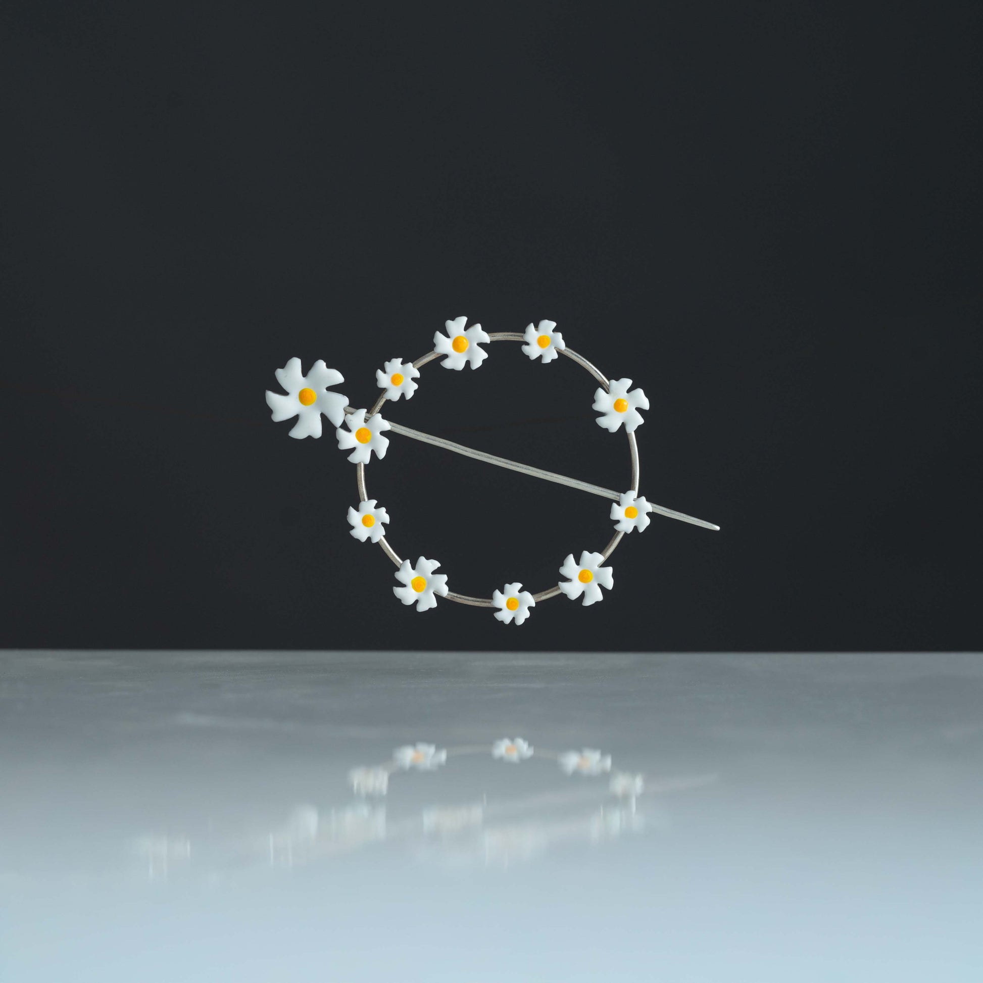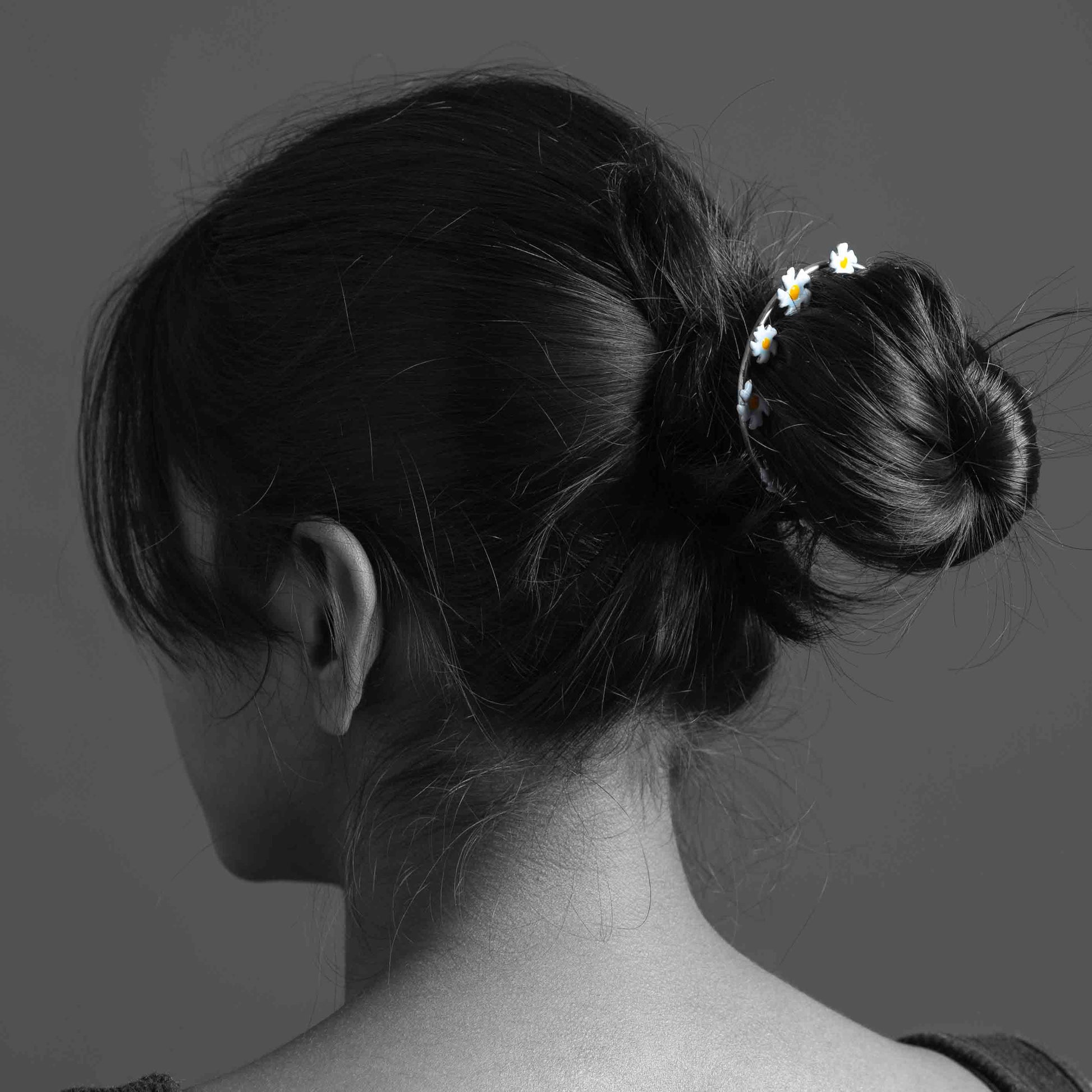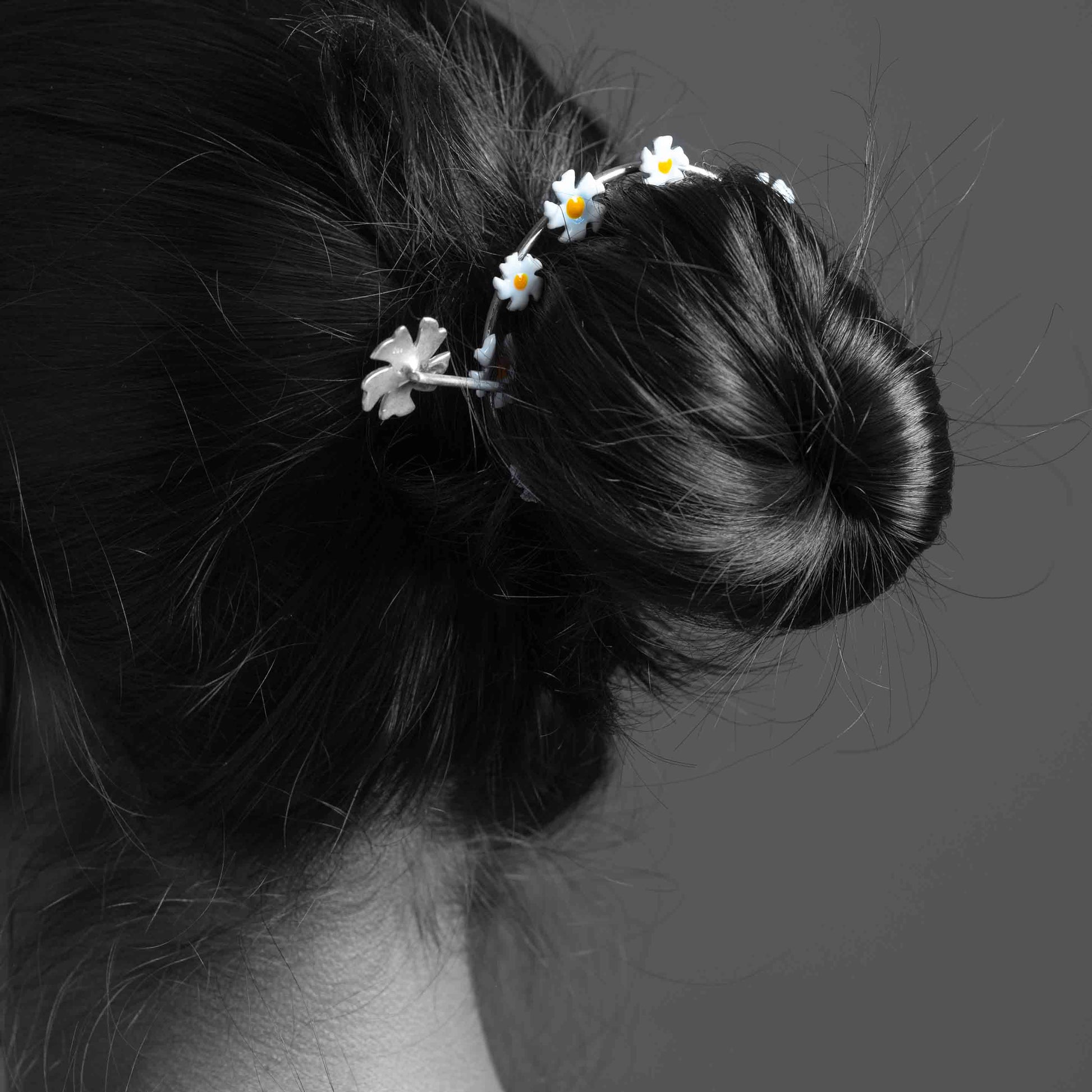 This elegant bun cuff features a delicate circular design adorned with twelve miniature Parijata flowers crafted in pure silver (92.5%). Each flower showcases pristine white enamel petals with vibrant yellow centers, creating a garland effect that gracefully encircles your hair. The slender silver pin secures the piece comfortably in place while maintaining a lightweight feel.