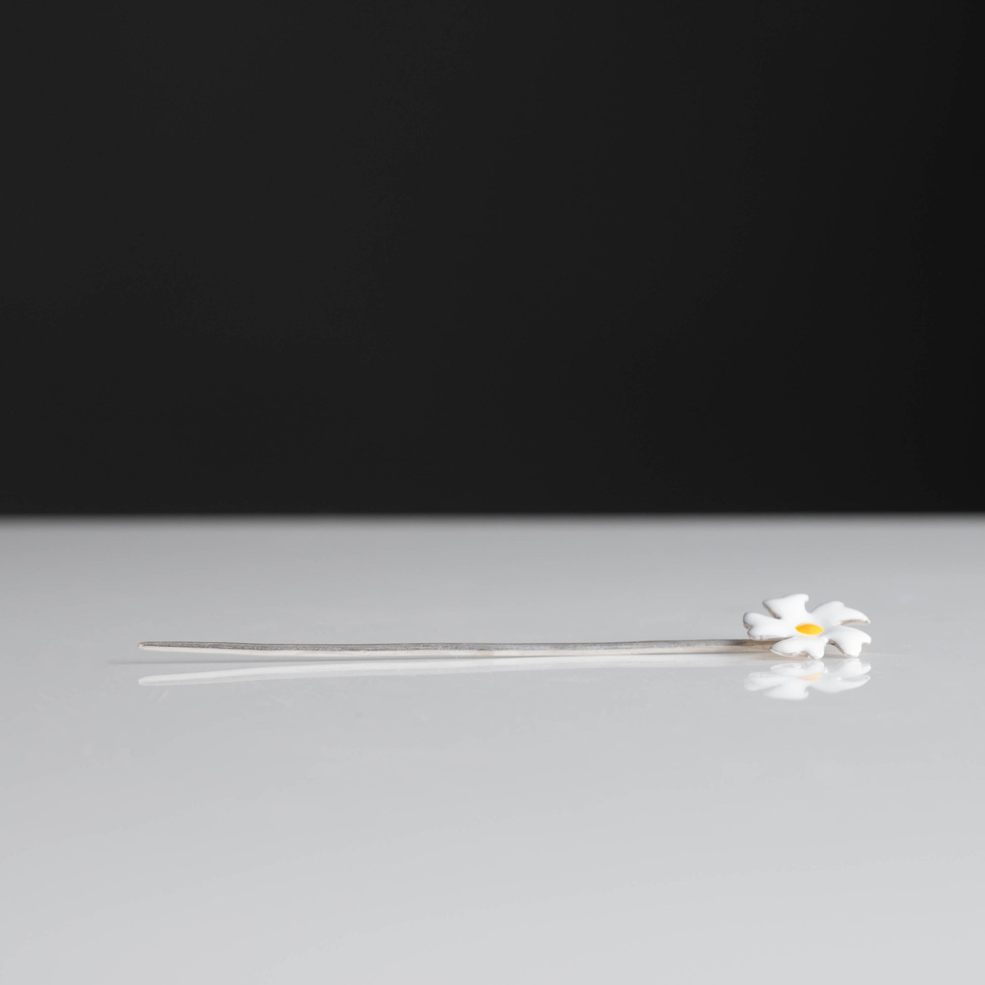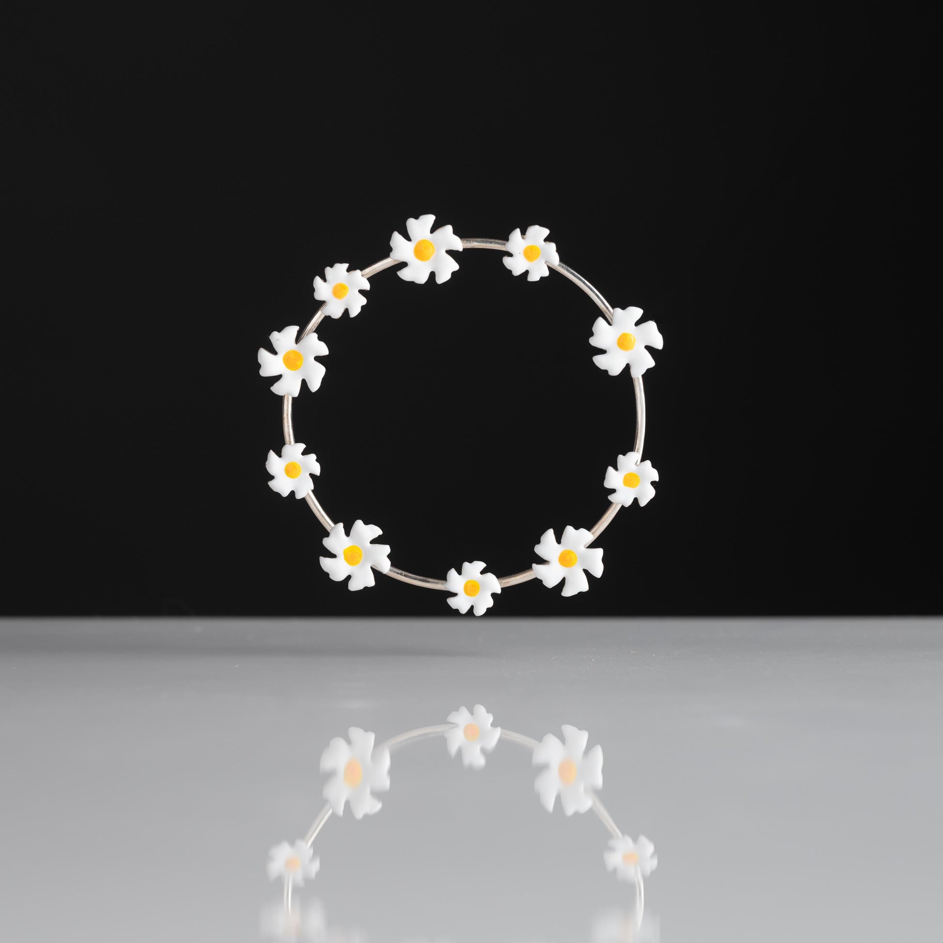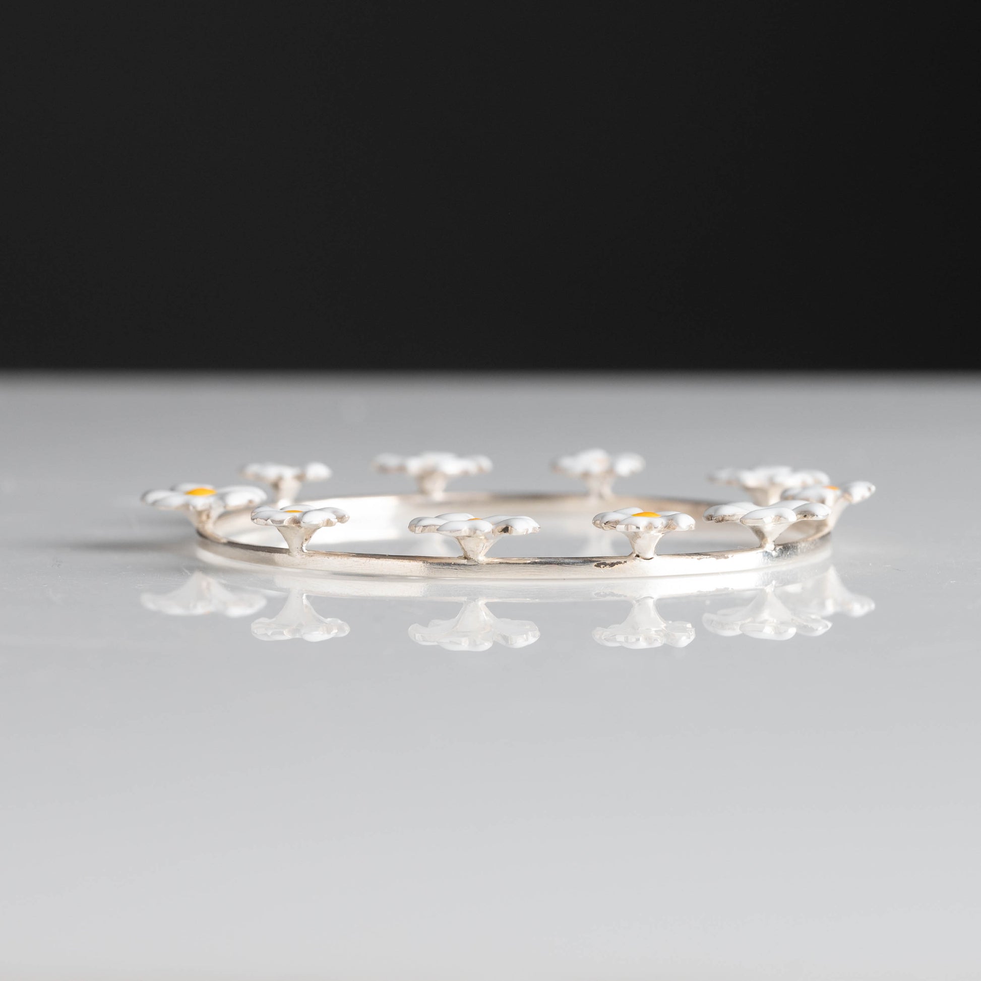 This elegant bun cuff features a delicate circular design adorned with twelve miniature Parijata flowers crafted in pure silver (92.5%). Each flower showcases pristine white enamel petals with vibrant yellow centers, creating a garland effect that gracefully encircles your hair. The slender silver pin secures the piece comfortably in place while maintaining a lightweight feel.