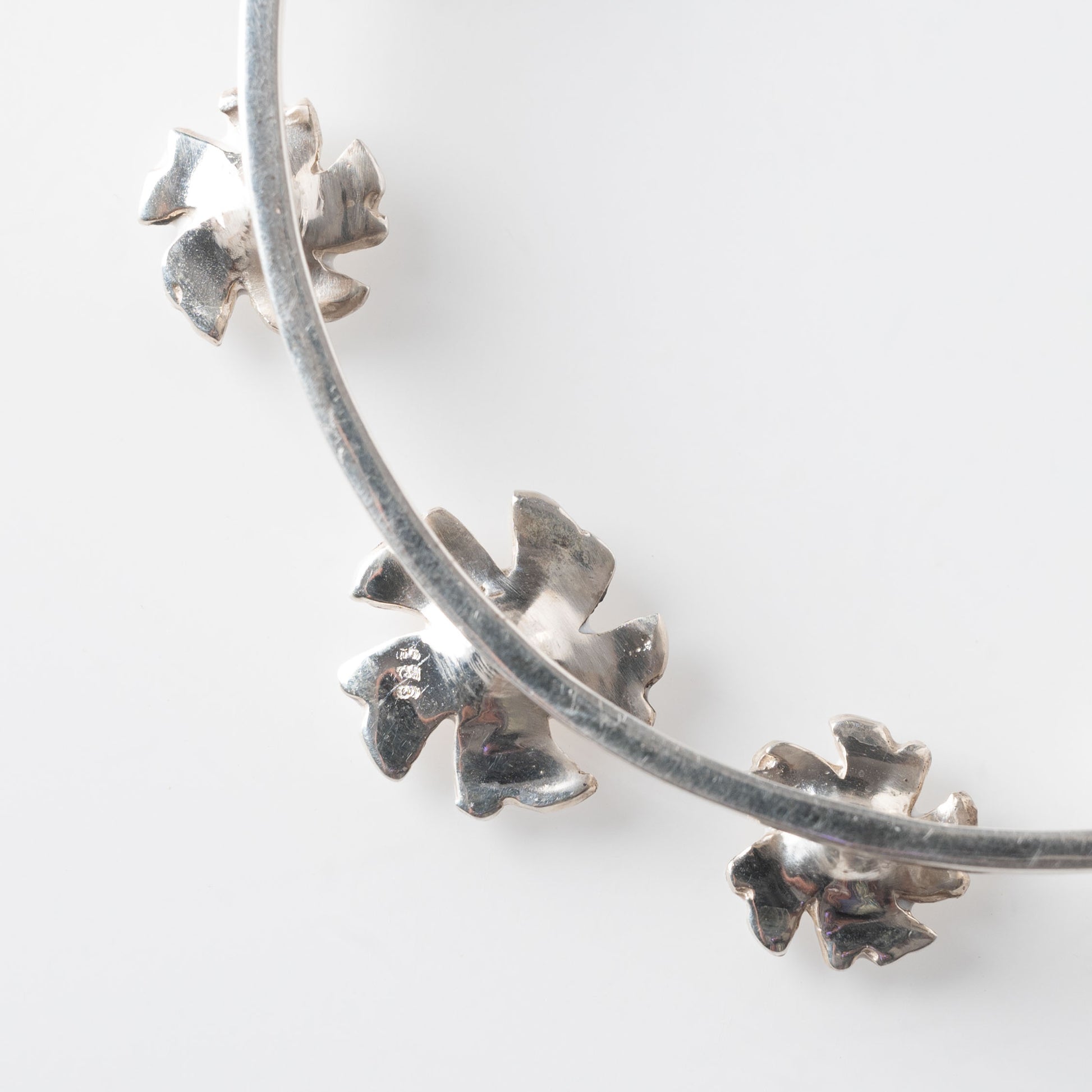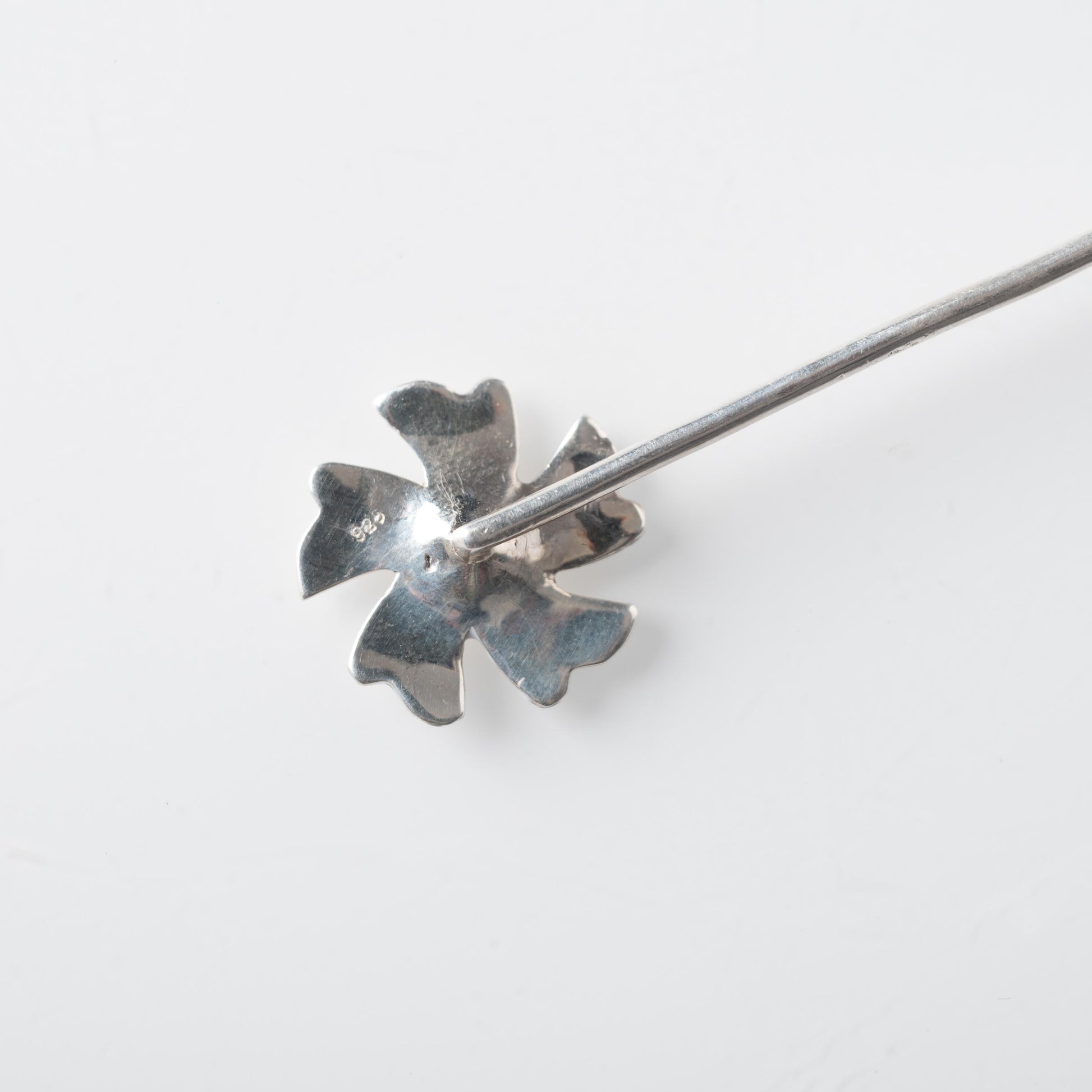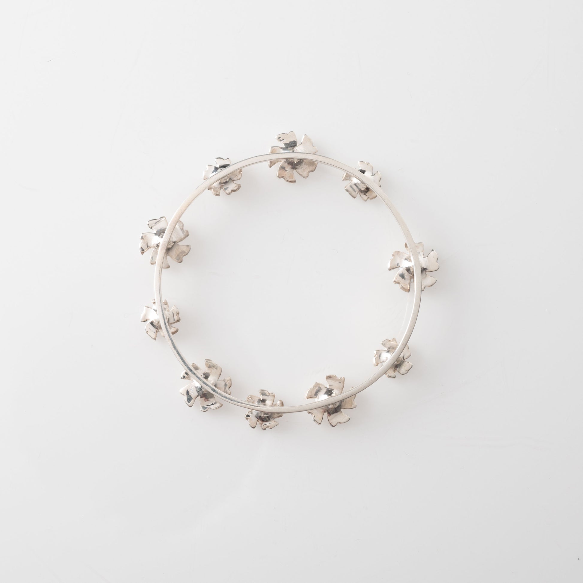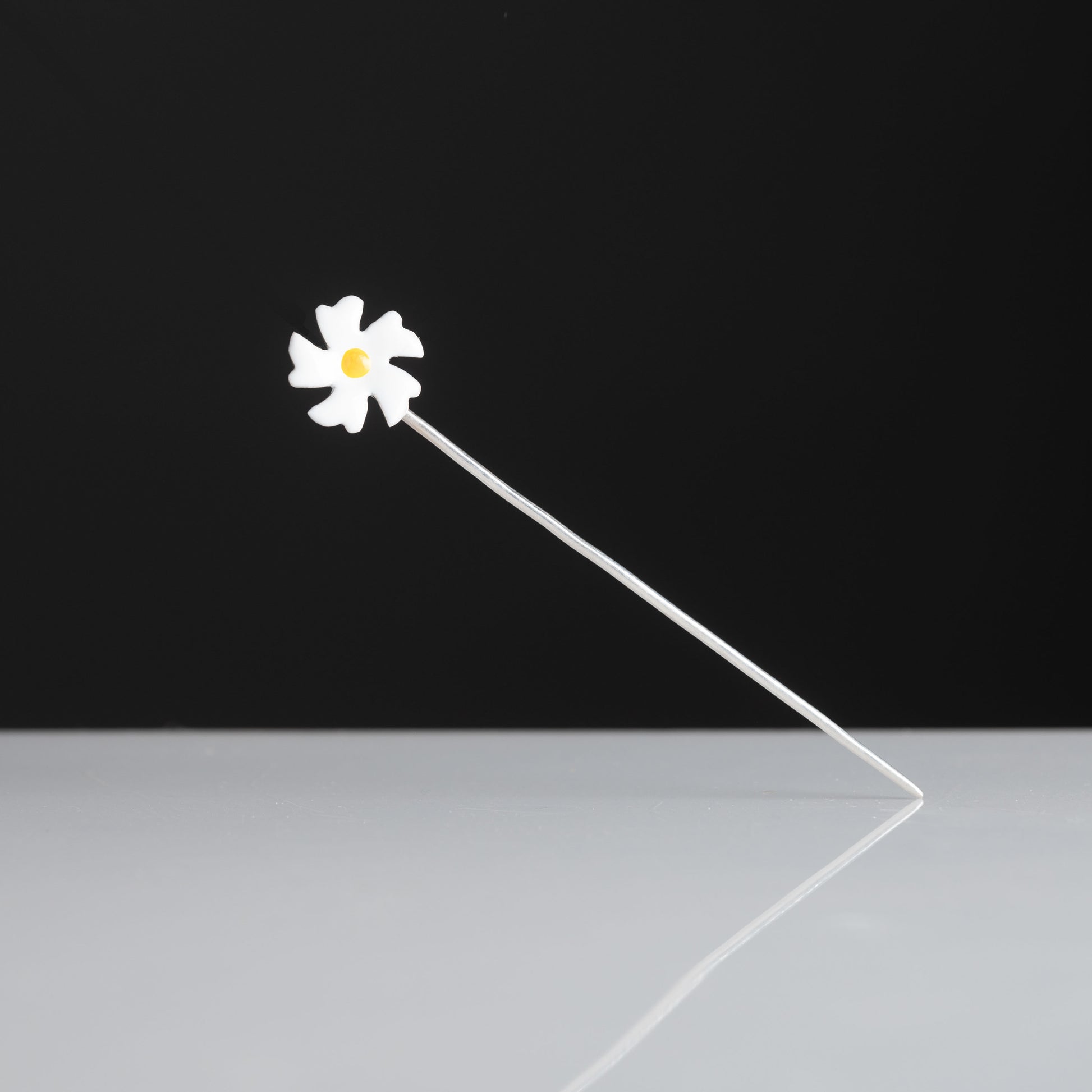 This elegant bun cuff features a delicate circular design adorned with twelve miniature Parijata flowers crafted in pure silver (92.5%). Each flower showcases pristine white enamel petals with vibrant yellow centers, creating a garland effect that gracefully encircles your hair. The slender silver pin secures the piece comfortably in place while maintaining a lightweight feel.