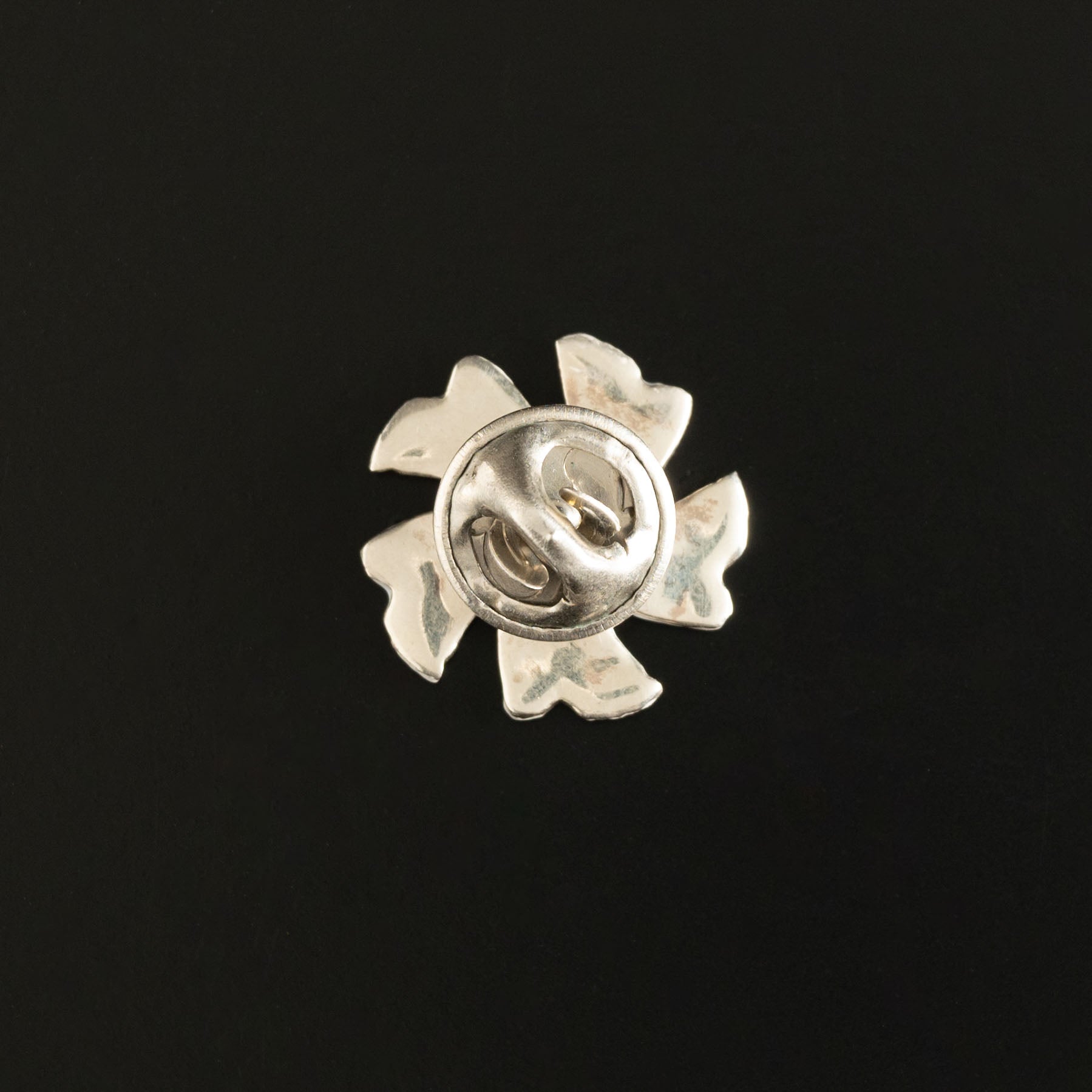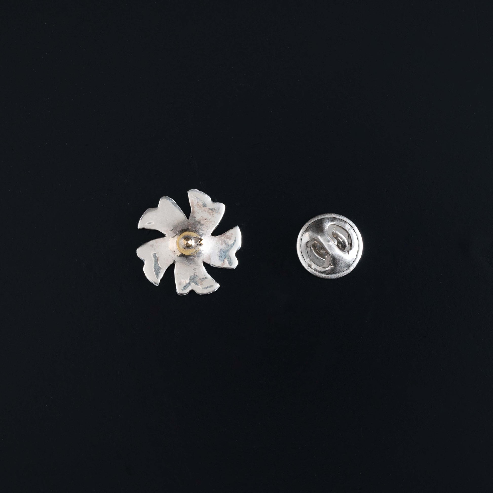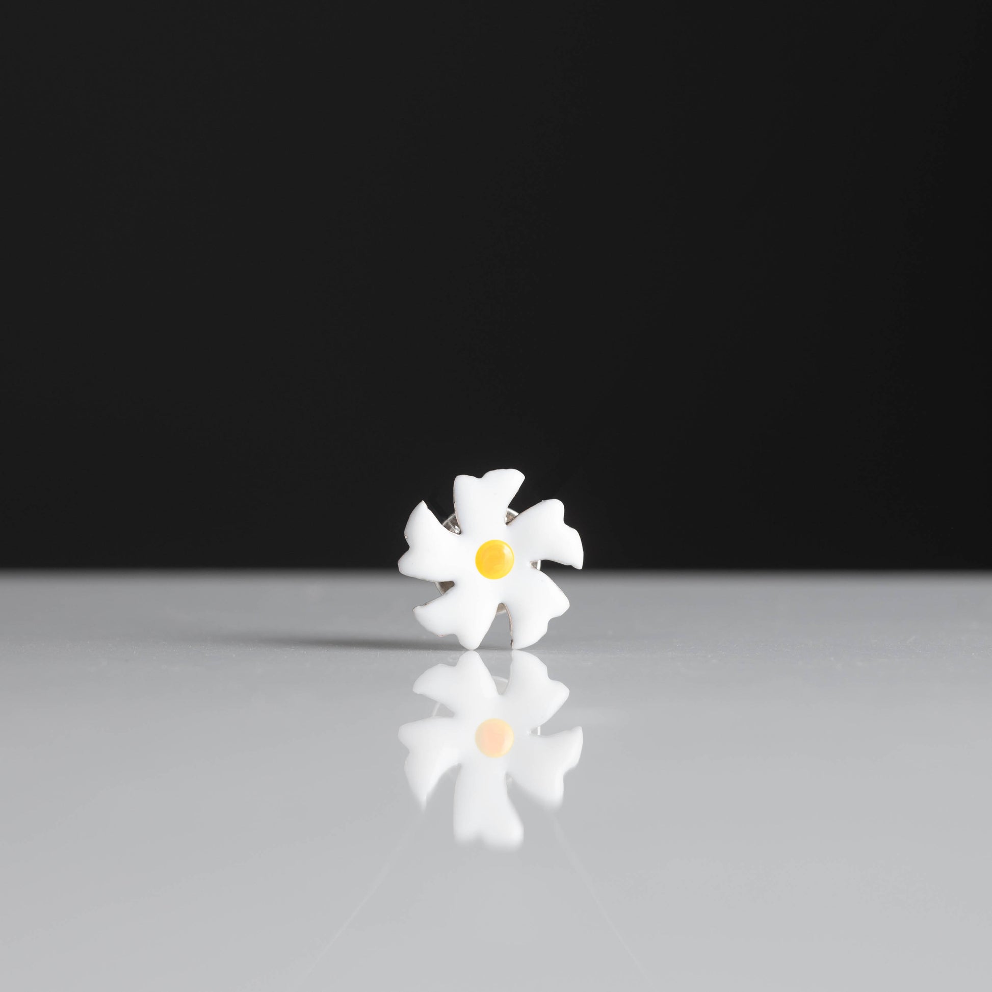 This minimalist brooch features a beautifully crafted Parijata flower with six white enamel petals and a vibrant yellow center. Meticulously handcrafted in pure silver (92.5%), the clean lines and contemporary design make it versatile enough for both casual and formal occasions. Wear it on lapels, scarves, or as shown, pinned to the neckline of a simple top to add an elegant touch to any outfit. The delicate size makes it a subtle statement piece that embodies modern sophistication while celebrating traditional craftsmanship.