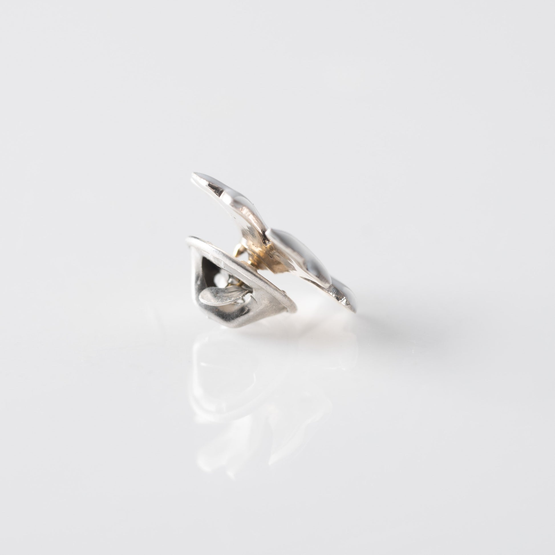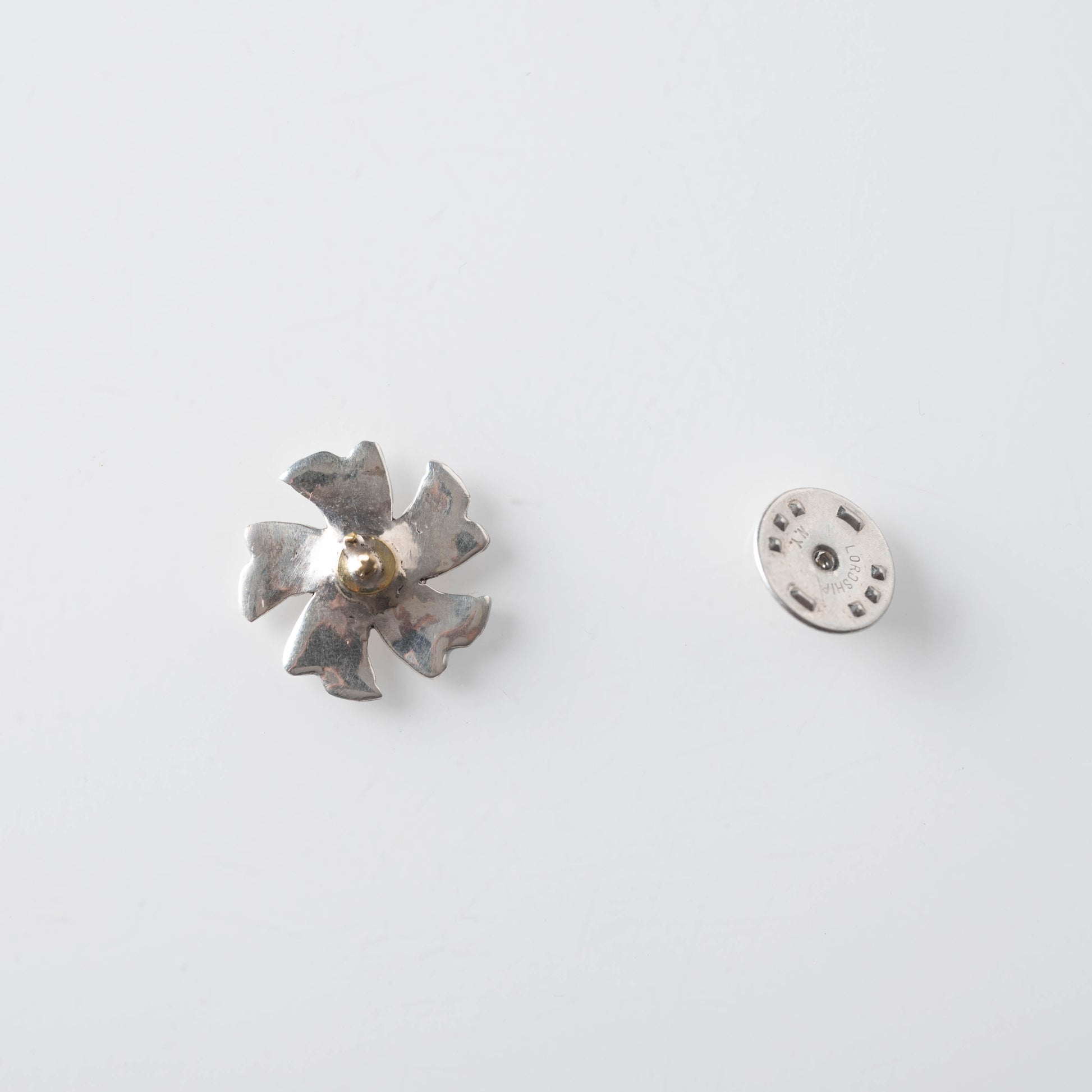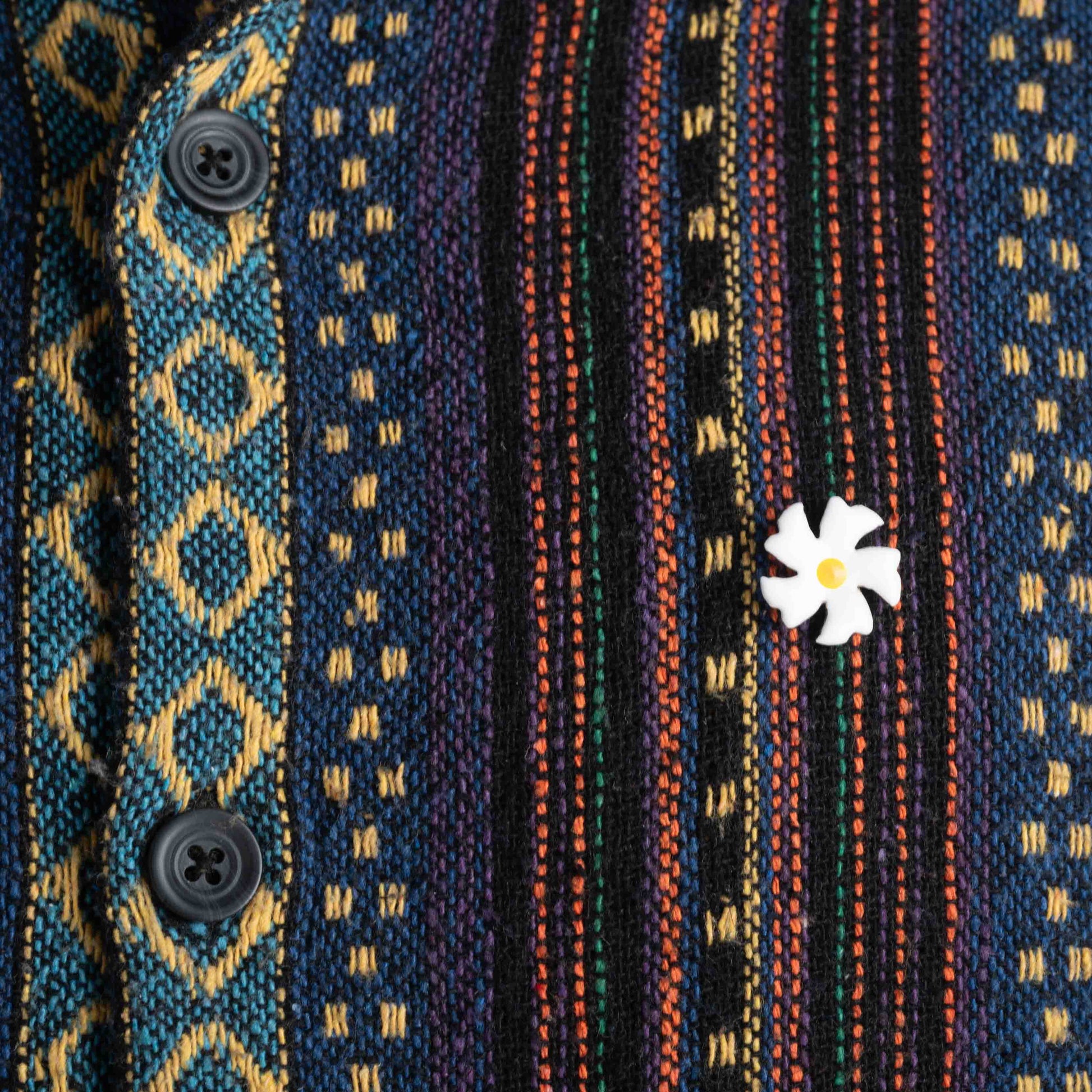 This minimalist brooch features a beautifully crafted Parijata flower with six white enamel petals and a vibrant yellow center. Meticulously handcrafted in pure silver (92.5%), the clean lines and contemporary design make it versatile enough for both casual and formal occasions. Wear it on lapels, scarves, or as shown, pinned to the neckline of a simple top to add an elegant touch to any outfit. The delicate size makes it a subtle statement piece that embodies modern sophistication while celebrating traditional craftsmanship.