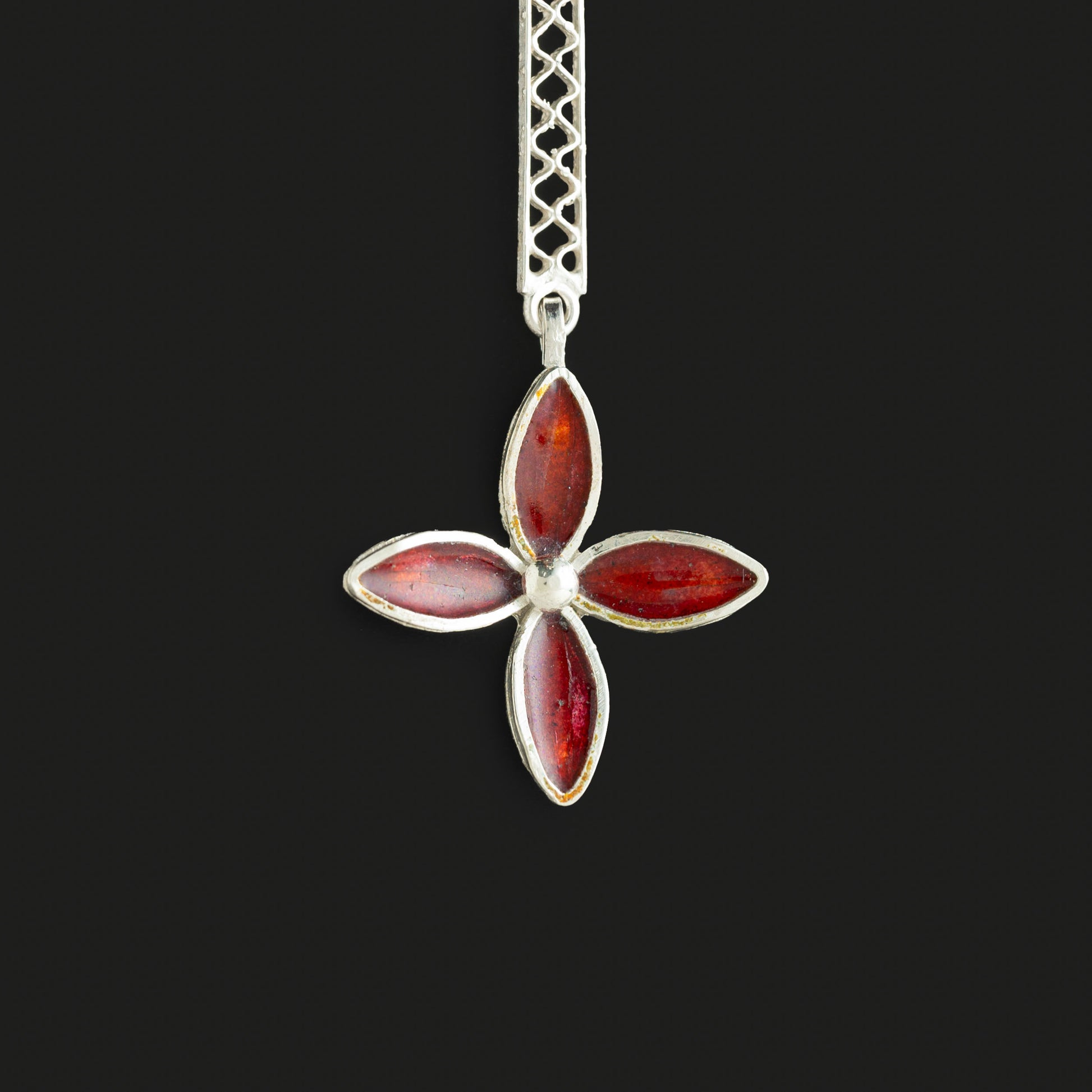 The dramatic vertical lines culminate in the signature four-petal Ashoka blossom, rendered entirely in rich crimson enamel that captures the flower's vibrant essence. The substantial length and weight of these earrings create beautiful movement, while the geometric precision of the filigree work provides a contemporary edge to this deeply traditional craft technique.