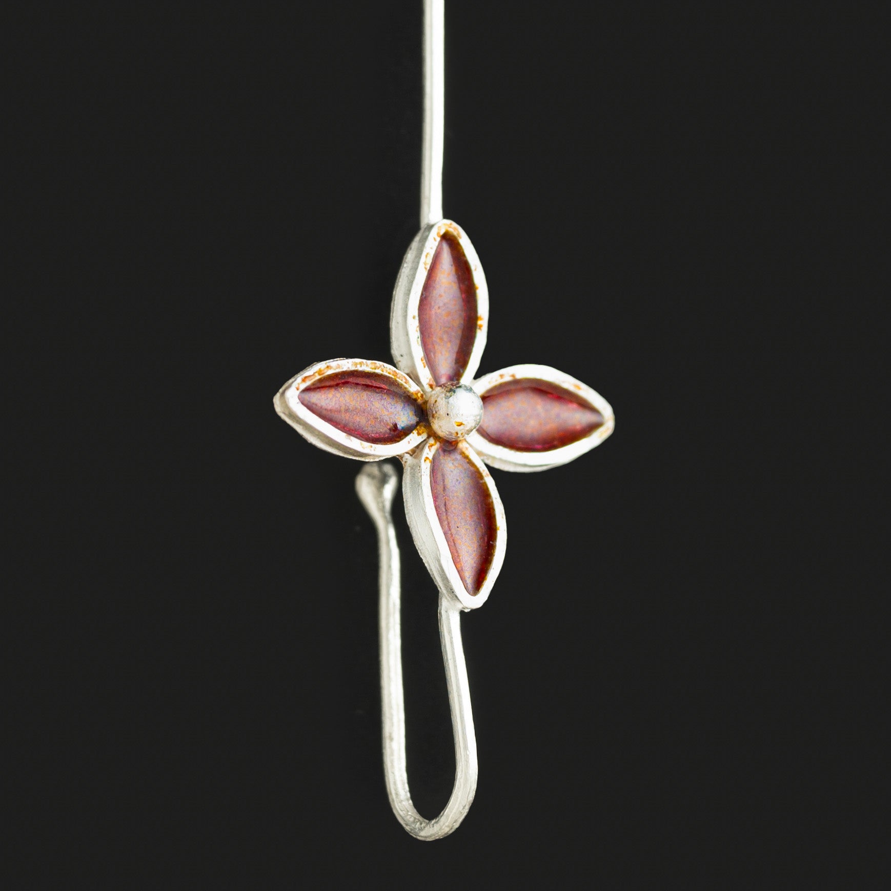 The four-petal Ashoka blossom, rendered in gradient crimson enamel, is perfectly positioned along the vertical axis, appearing to orbit within the silver framework like a celestial body in motion. This innovative design creates beautiful shadows and light play, making each movement a kinetic art experience.