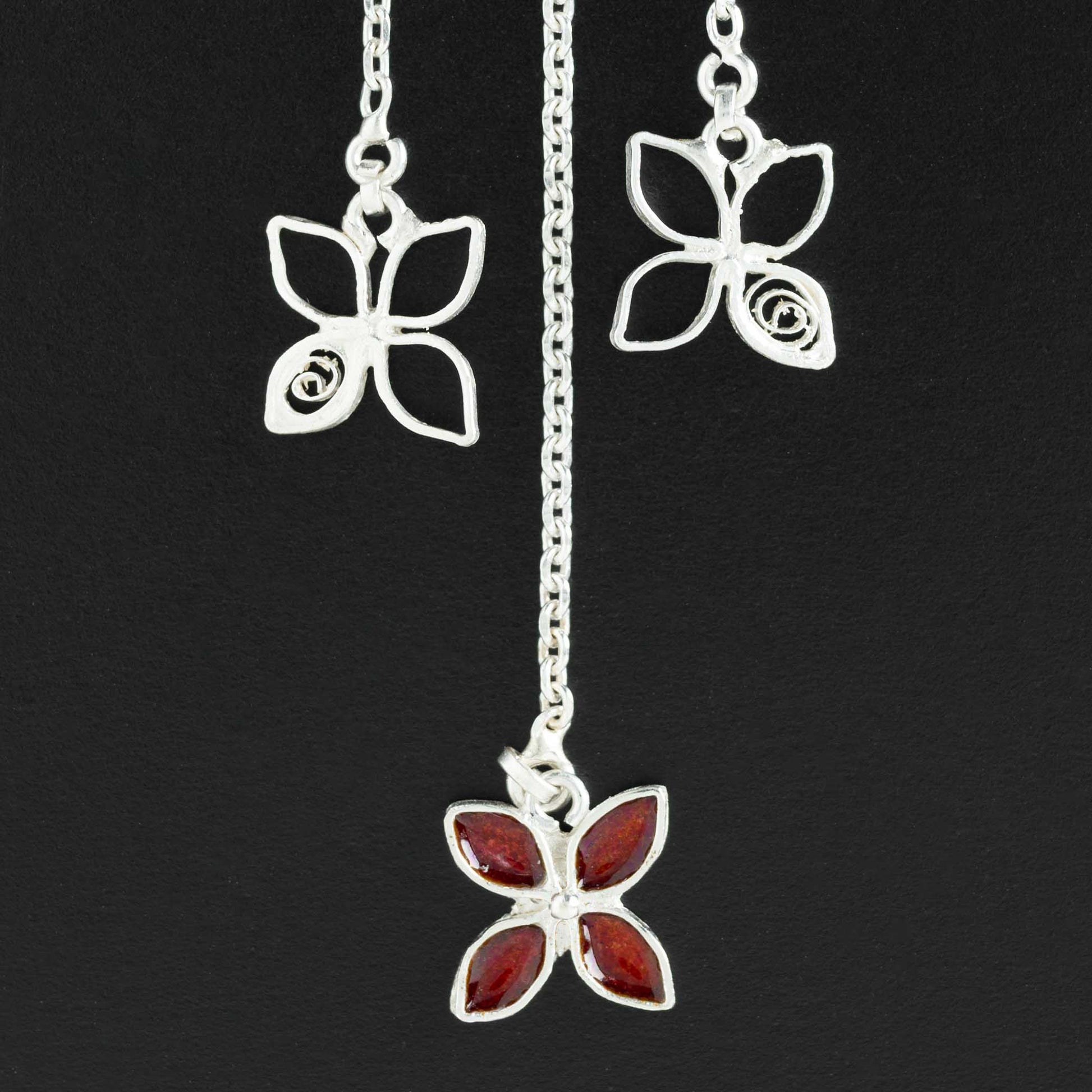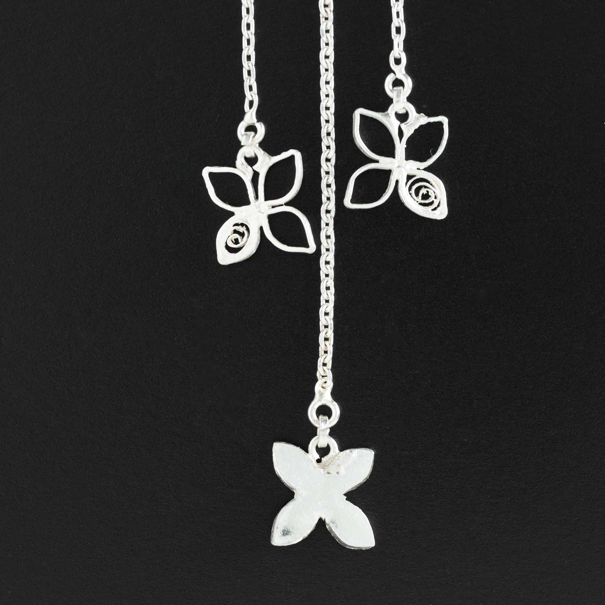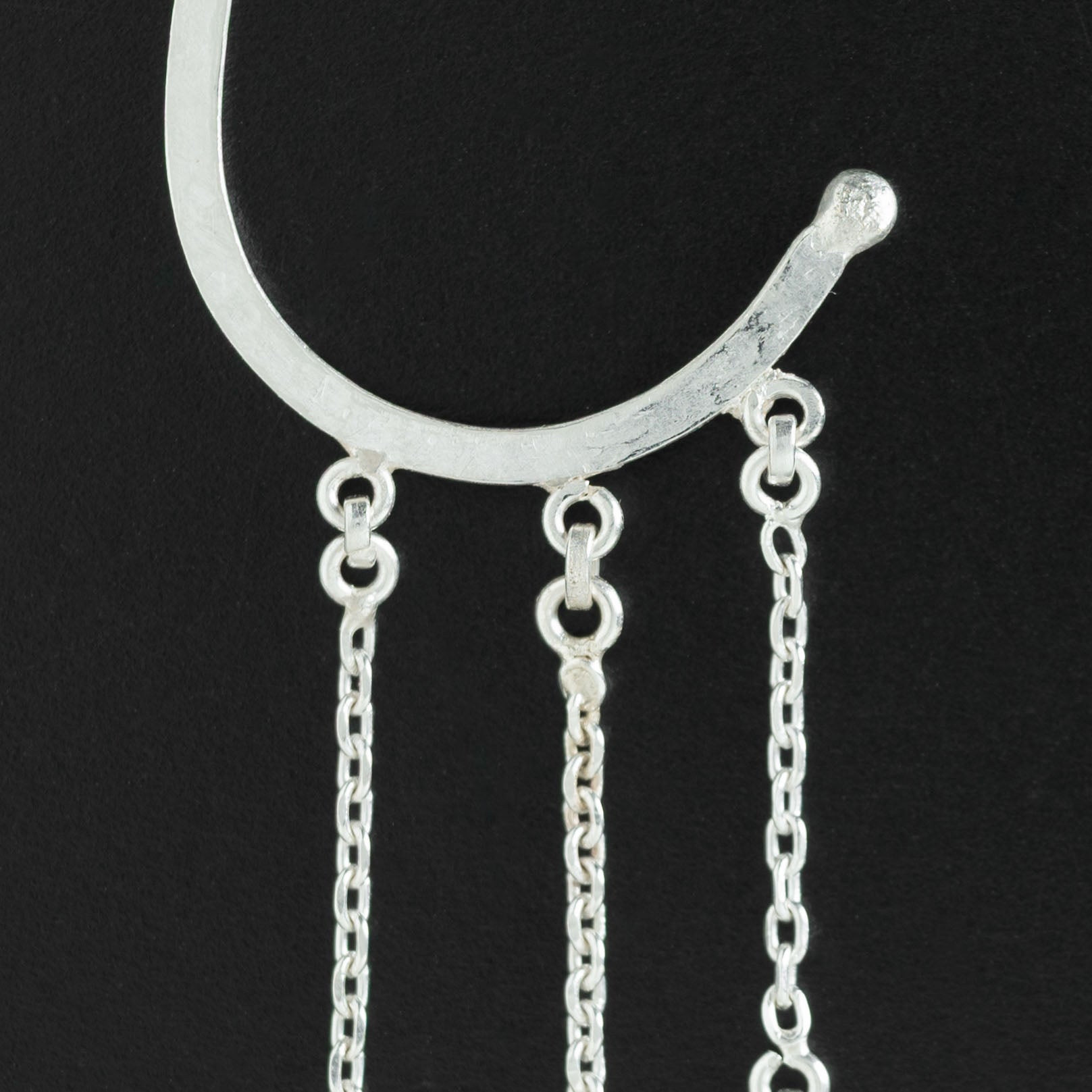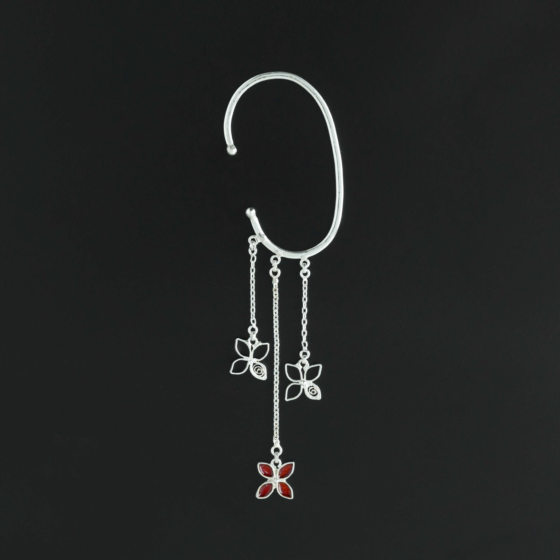 "The Ashoka Blossom Cascade Ear Cuff offers a contemporary take on traditional ear ornamentation, featuring an elegant oval cuff with three cascading chains of varying lengths. Each chain is adorned with delicate Ashoka flower motifs in silver filigree and enamel work, creating beautiful movement and visual interest.