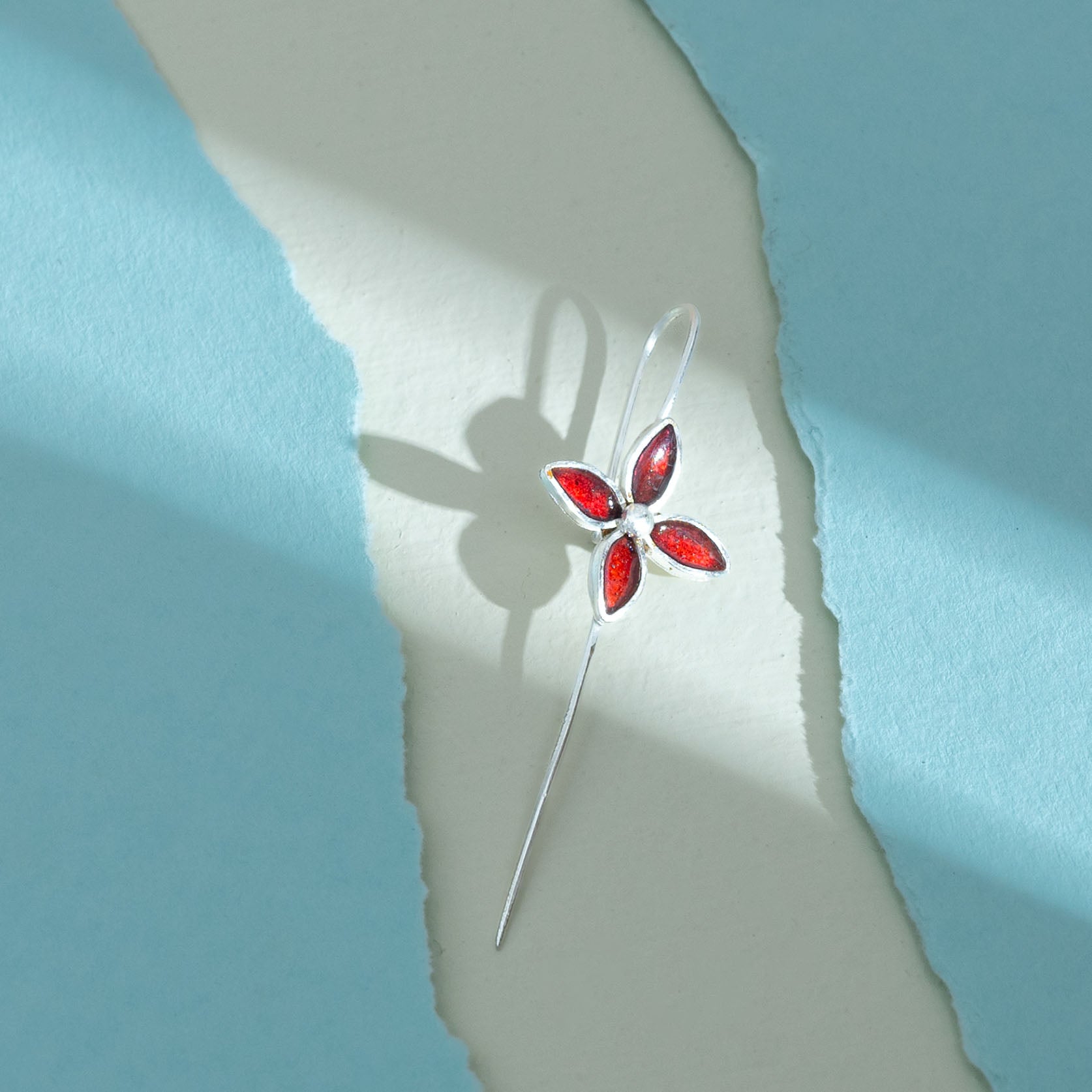 The four-petal Ashoka blossom, rendered in gradient crimson enamel, is perfectly positioned along the vertical axis, appearing to orbit within the silver framework like a celestial body in motion. This innovative design creates beautiful shadows and light play, making each movement a kinetic art experience.