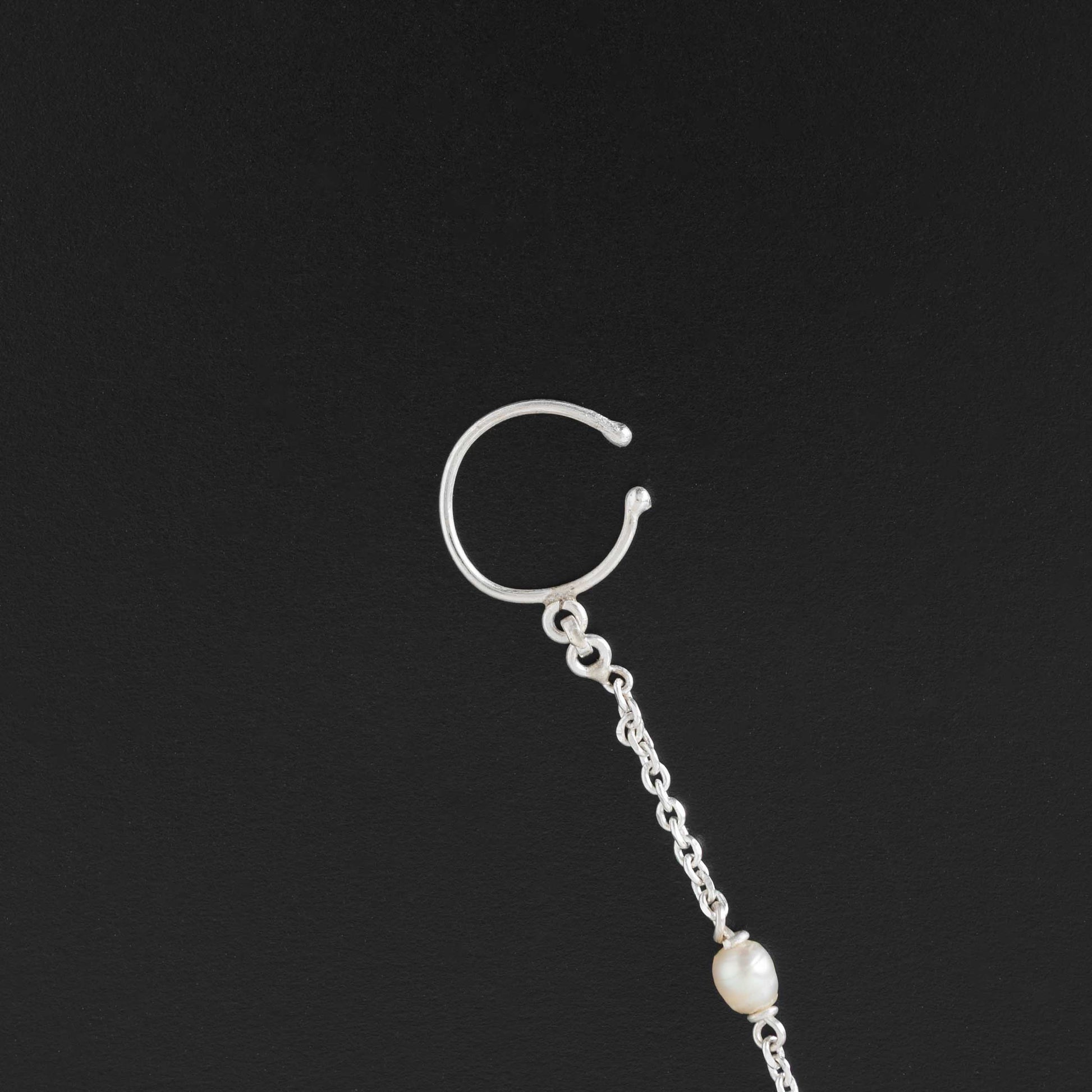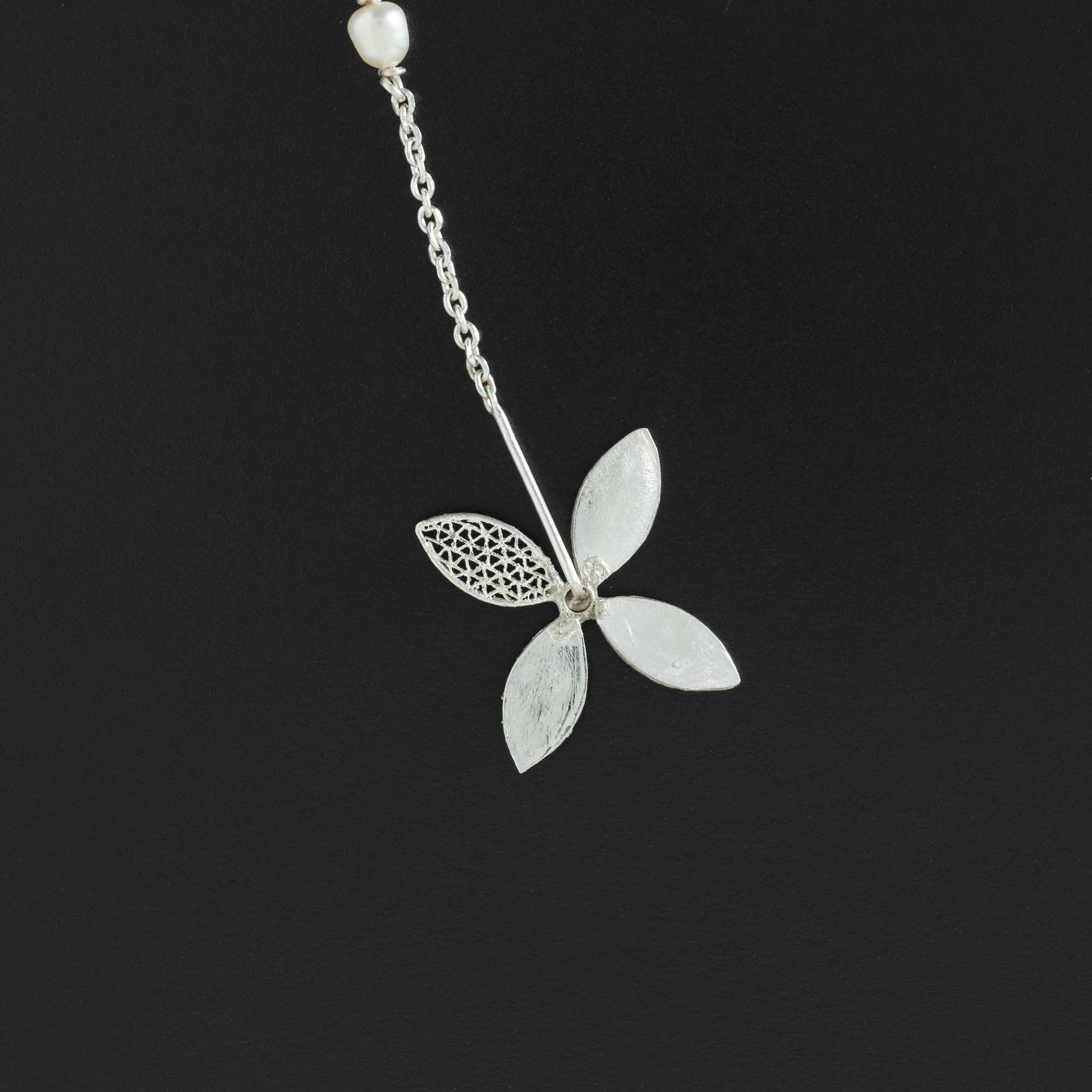 "The Ashoka Petal Chain Earring features an elegant long chain design with delicate pearl accents leading to a single Ashoka flower pendant. The minimalist approach highlights the beauty of the four-petaled bloom rendered in crimson enamel and silver filigree work, perfect for contemporary styling.